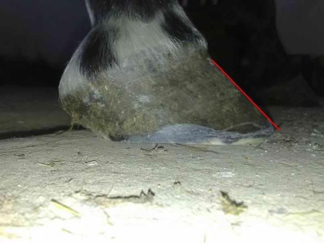 "Poza tym piętki - musisz cofnąć kąty wsporowe. Popatrz na zdjęciach z profilu na miejsca, gdzie kopyto styka się z ziemią w tylnej części, pociągnij z tego miejsca linię w górę. Powinna wyjść... ZA pęciną. jak wychodzi w środku albo co gorsza przed - jest źle. To psuje balans przednio-tylny kopyta."
