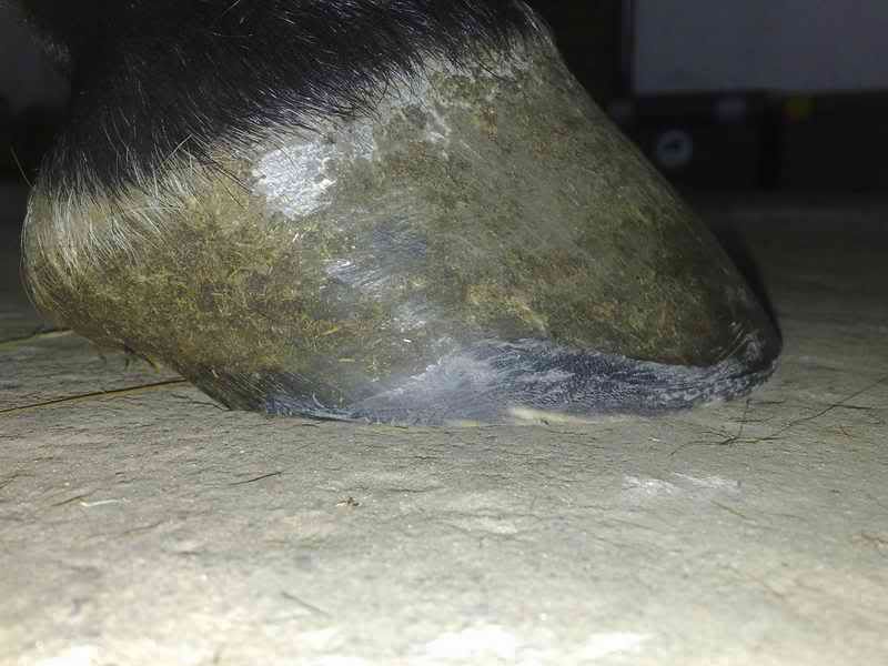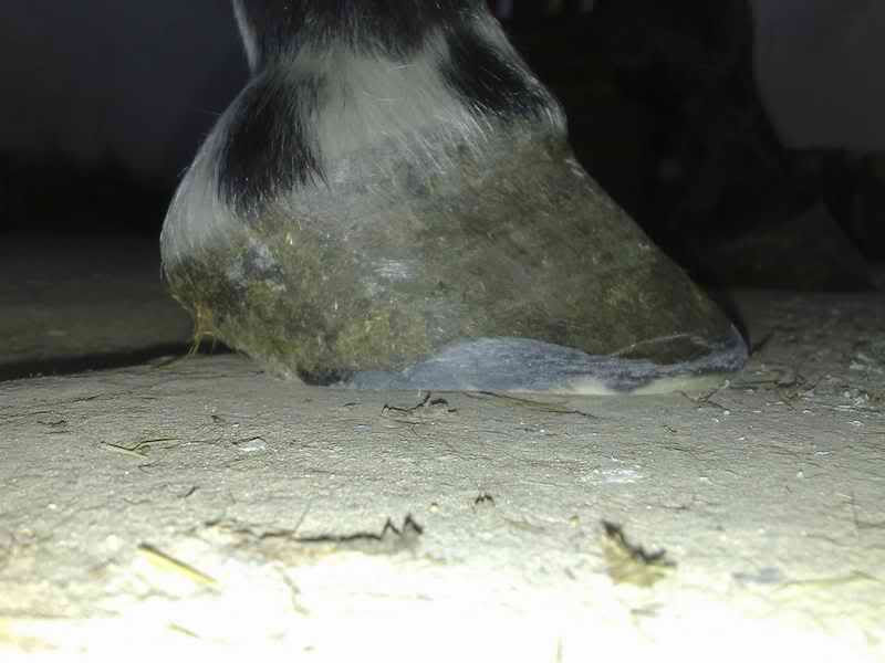 Od spodu patrząc, kąty wsporowe powinny kończyć się tam, gdzie najszersze miejsce strzałki. Szczególnie to kopyto kiepawo wygląda pod tym względem. Ściana kątów wsporowych idzie pod bardzo małym kątem do ziemi = położone piętki i wszystkie konsekwencje (trzeszczki, forward foot syndrome, odrywanie ściany z przodu...)