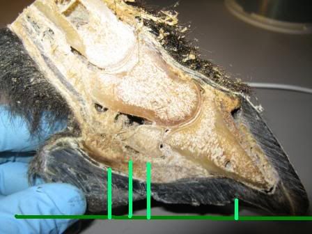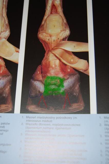 Dobrze tutaj widać, gdzie zaczyna się strzałka i gdzie względem niej jej kość. Gdzie jest "miejsce największego obciążenia strzałki" czyli centrum stawu kopytowego (który, przypominam, znajduje się na TYLNEJ części kości kopytowej oraz na jej połączeniu z trzeszczką kopytową) też łatwo zauważyć, szczególnie jeśli strzałka nie jest idealnie trójkątna. Np. tutaj na rudej kopytku dobrze widać, że w jednym miejscu strzałka jest wyraźnie szersza: