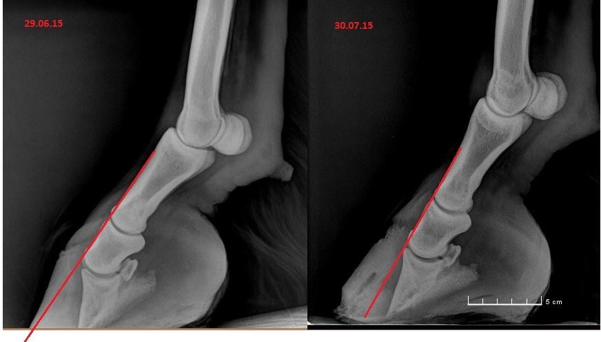 Czy ta noga nie miała kiedyś kontuzji ścięgna? Bo ja takie zbetonowanie przodu i równocześnie tyłu kopyta obserwuję u koni po kontuzji powierzchowengo, jak już paradoksalnie wrócą do pełnej roboty.