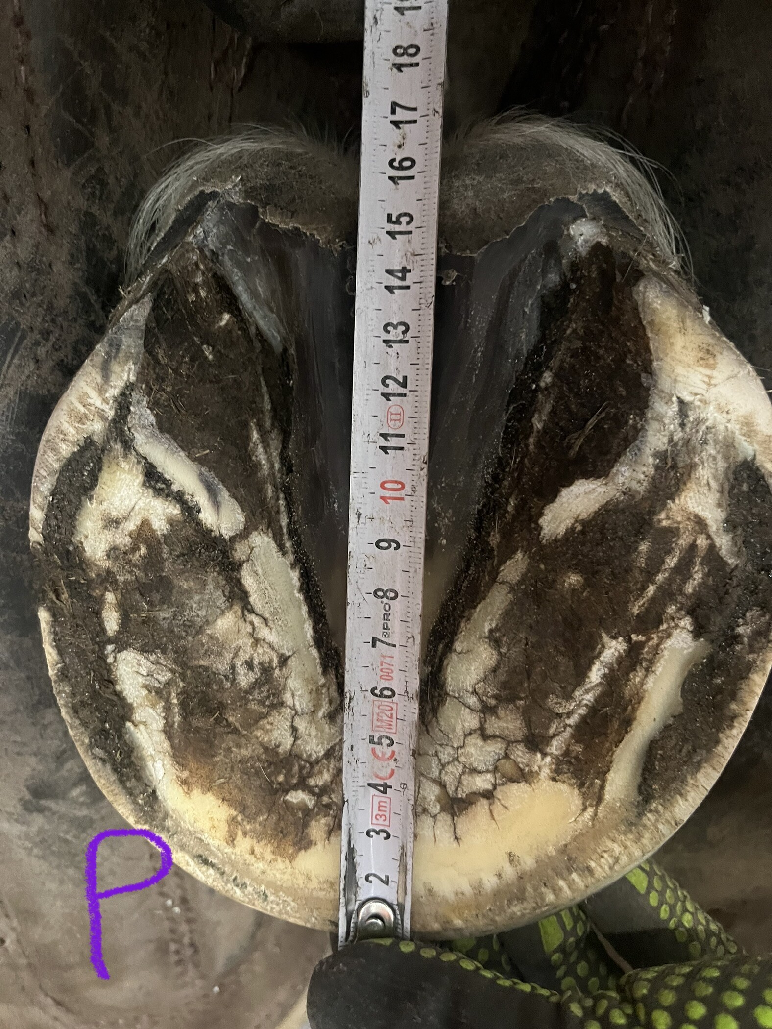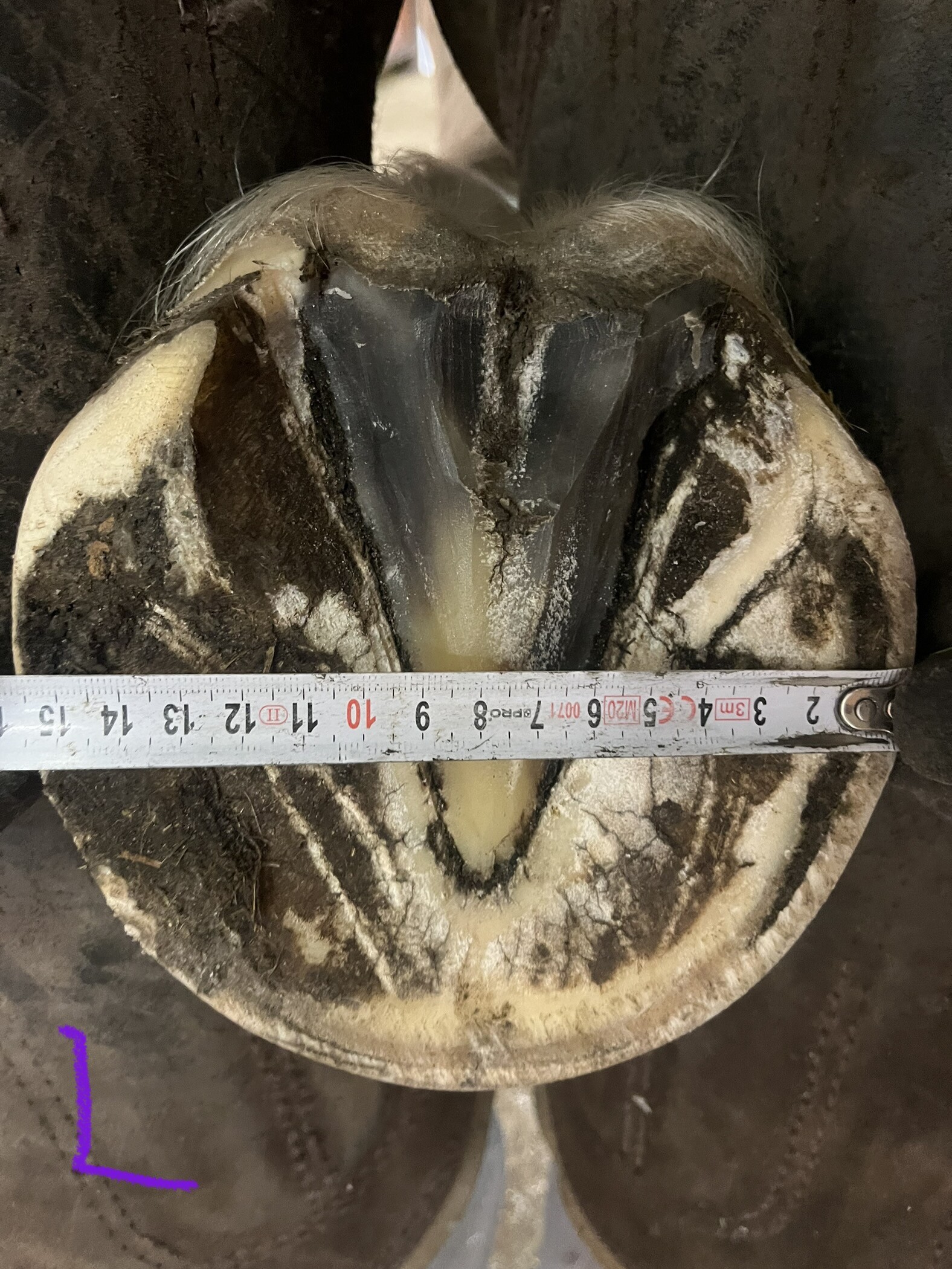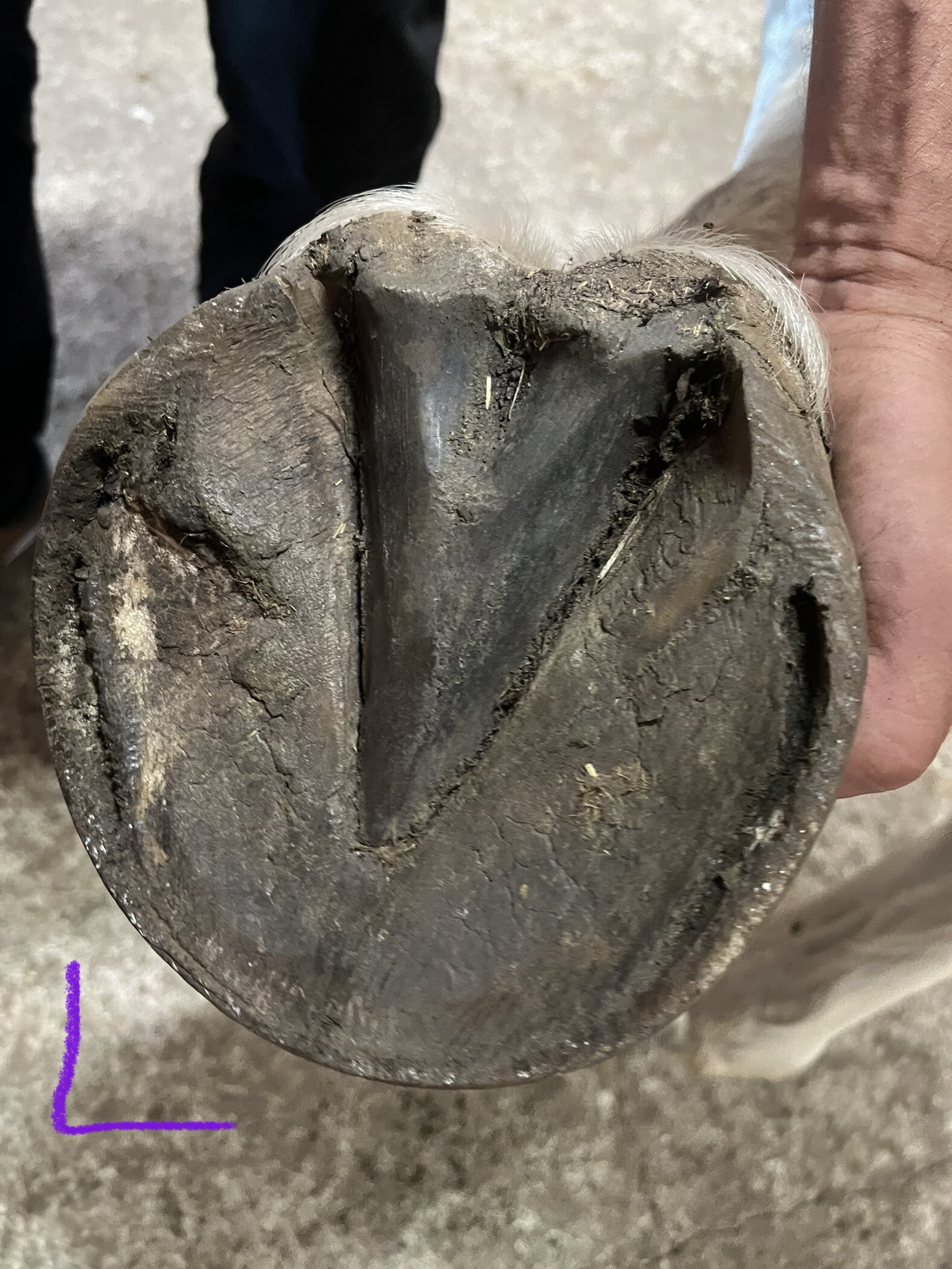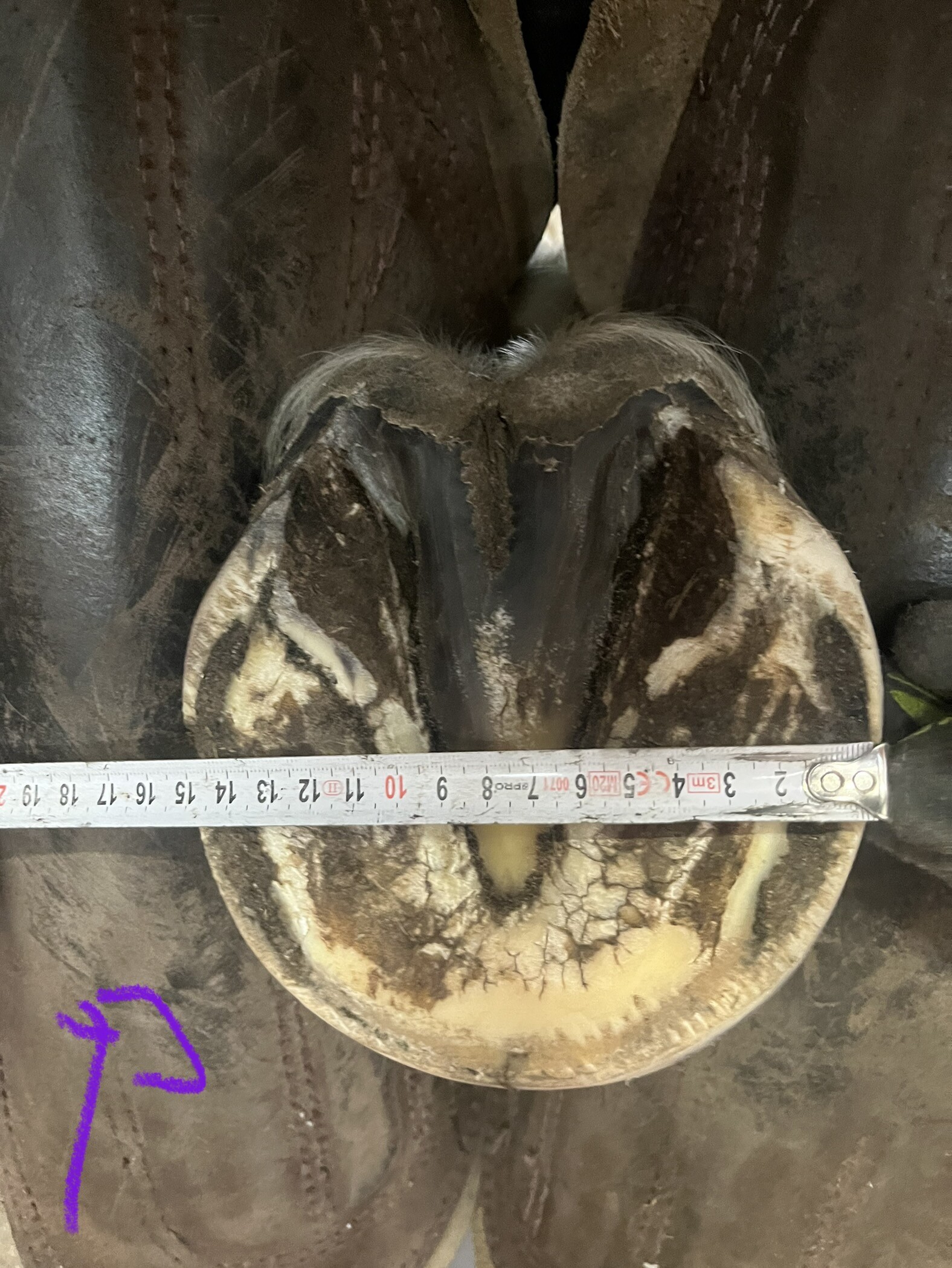 KaczkaKatastrofa, wątpię, żebyś znalazła buty pasujące na aktualny stan kopyt. Mają duże flary. Mogłabyś wrzucić podobne zdjęcia od podeszwy, ale porządnie wyczyszczonych kopyt? Nie widać dobrze czy to ściana jest tak oderwana i gromadzi się tam piach czy nie.
