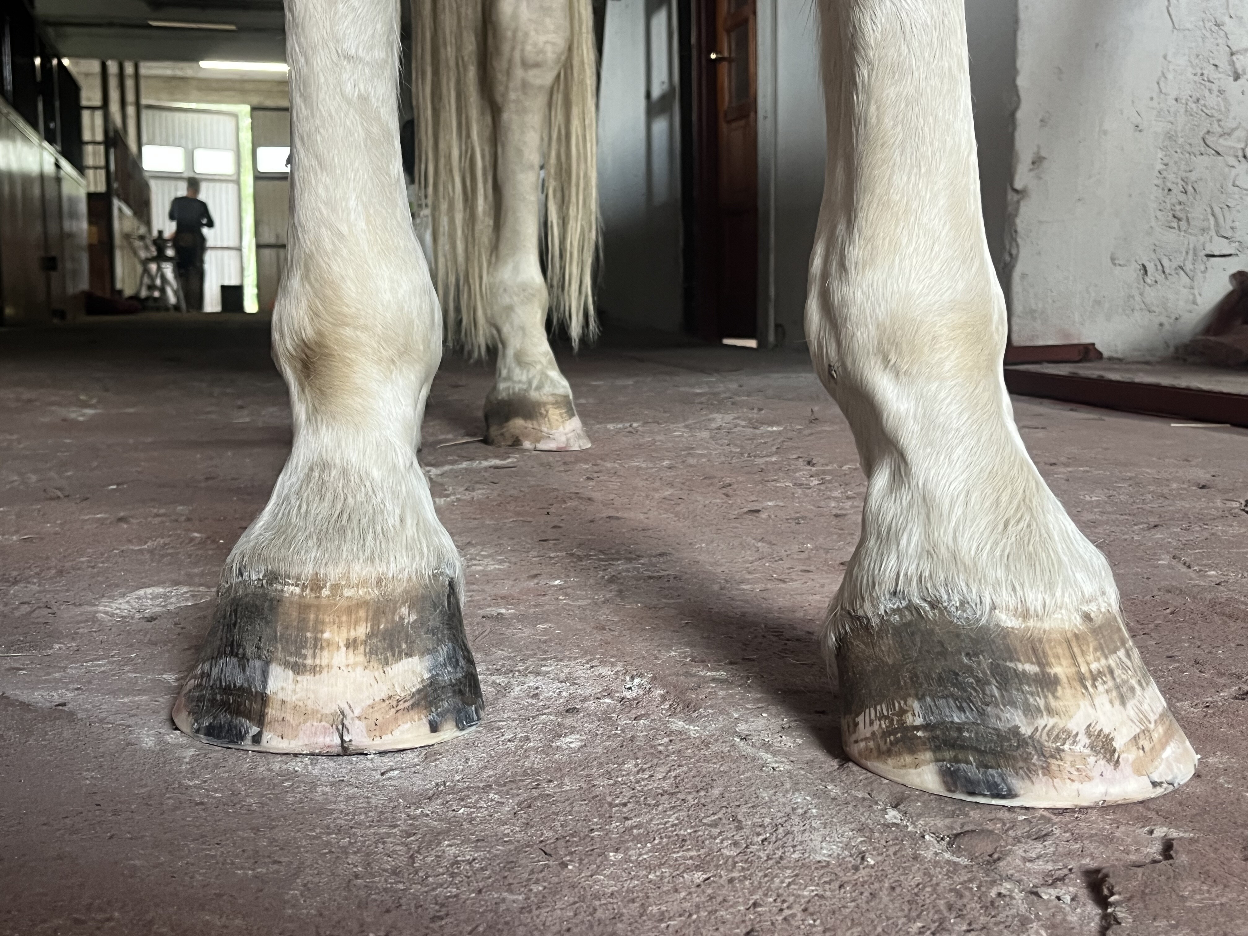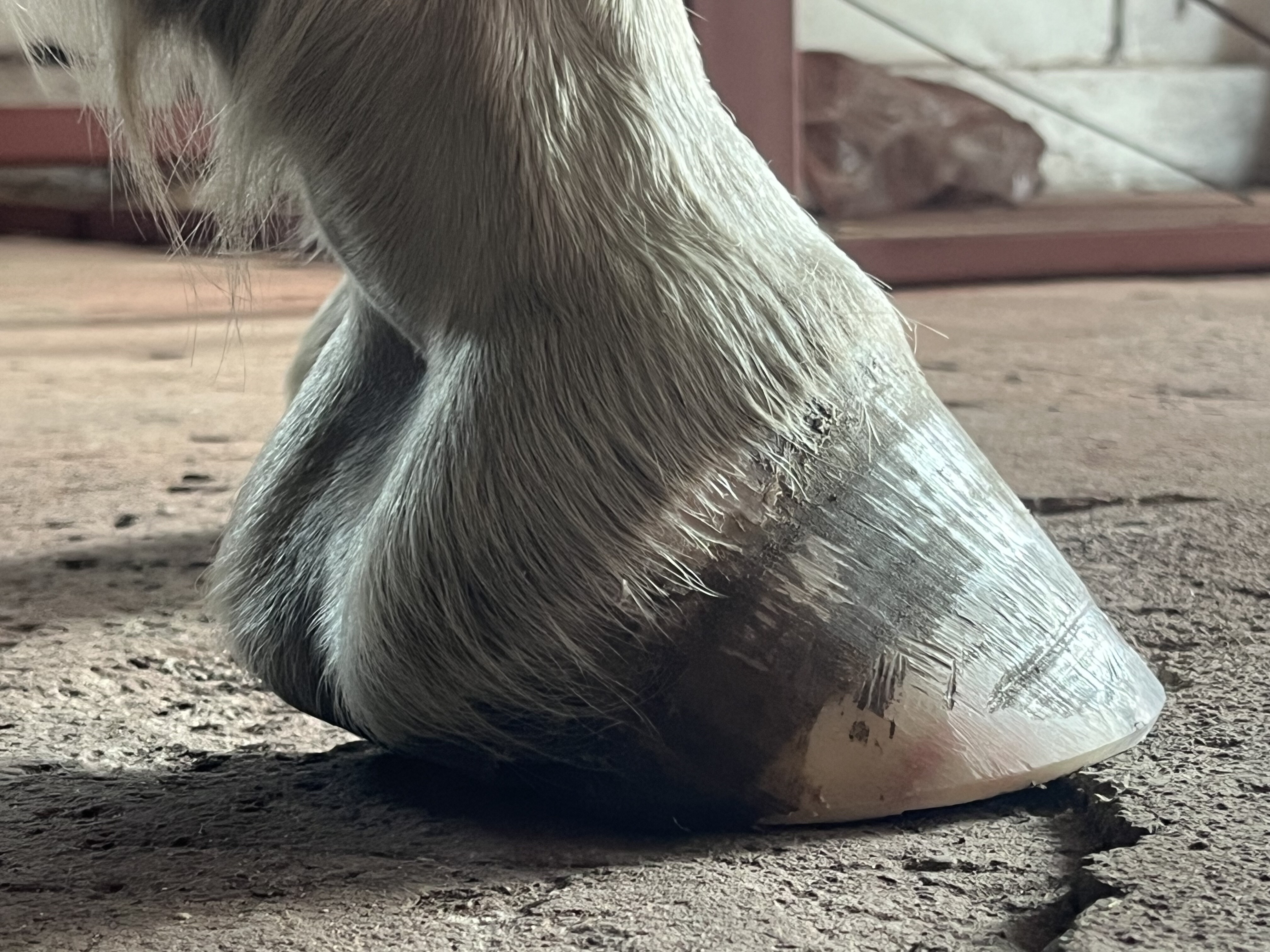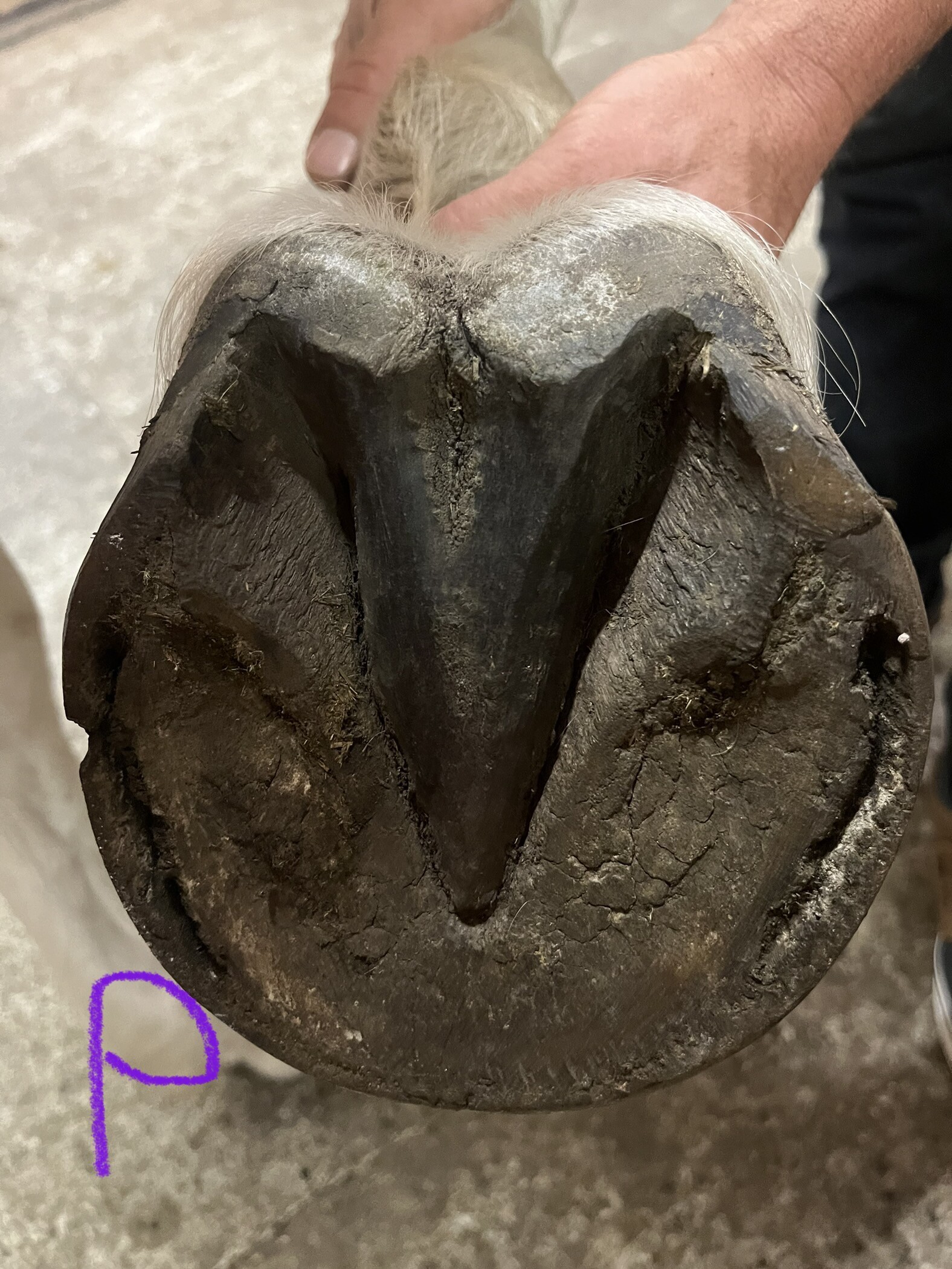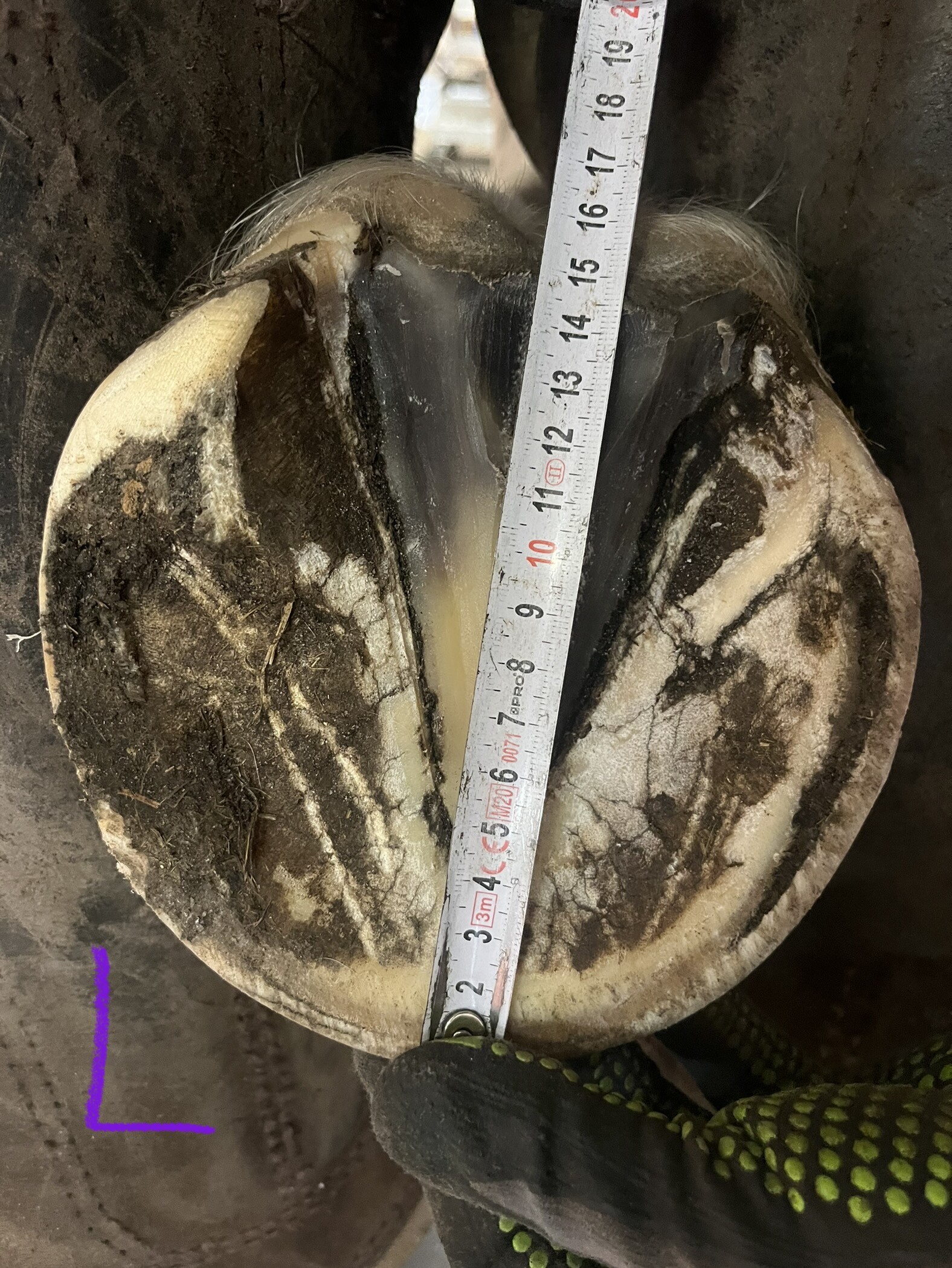 KaczkaKatastrofa, wątpię, żebyś znalazła buty pasujące na aktualny stan kopyt. Mają duże flary. Mogłabyś wrzucić podobne zdjęcia od podeszwy, ale porządnie wyczyszczonych kopyt? Nie widać dobrze czy to ściana jest tak oderwana i gromadzi się tam piach czy nie.