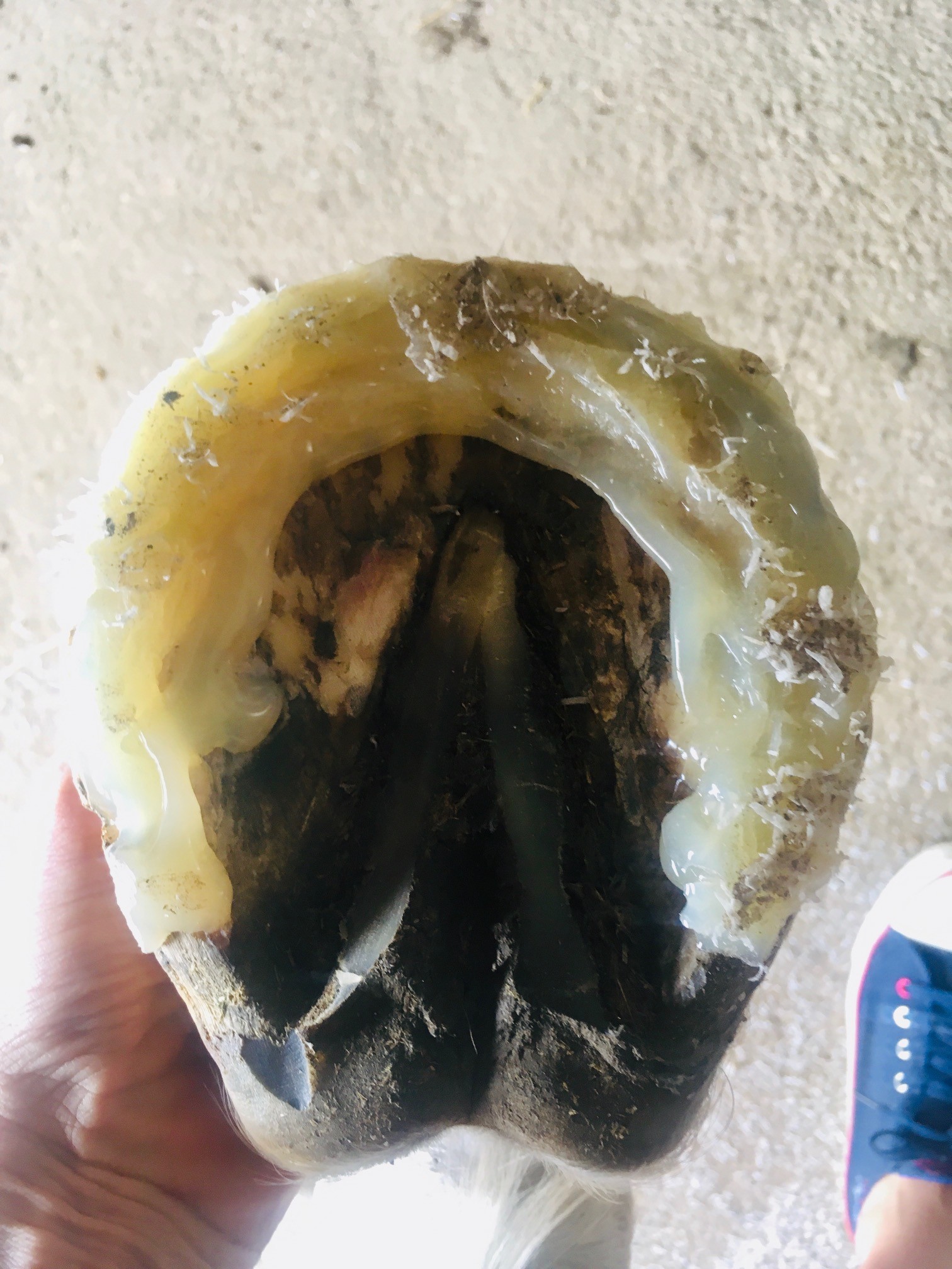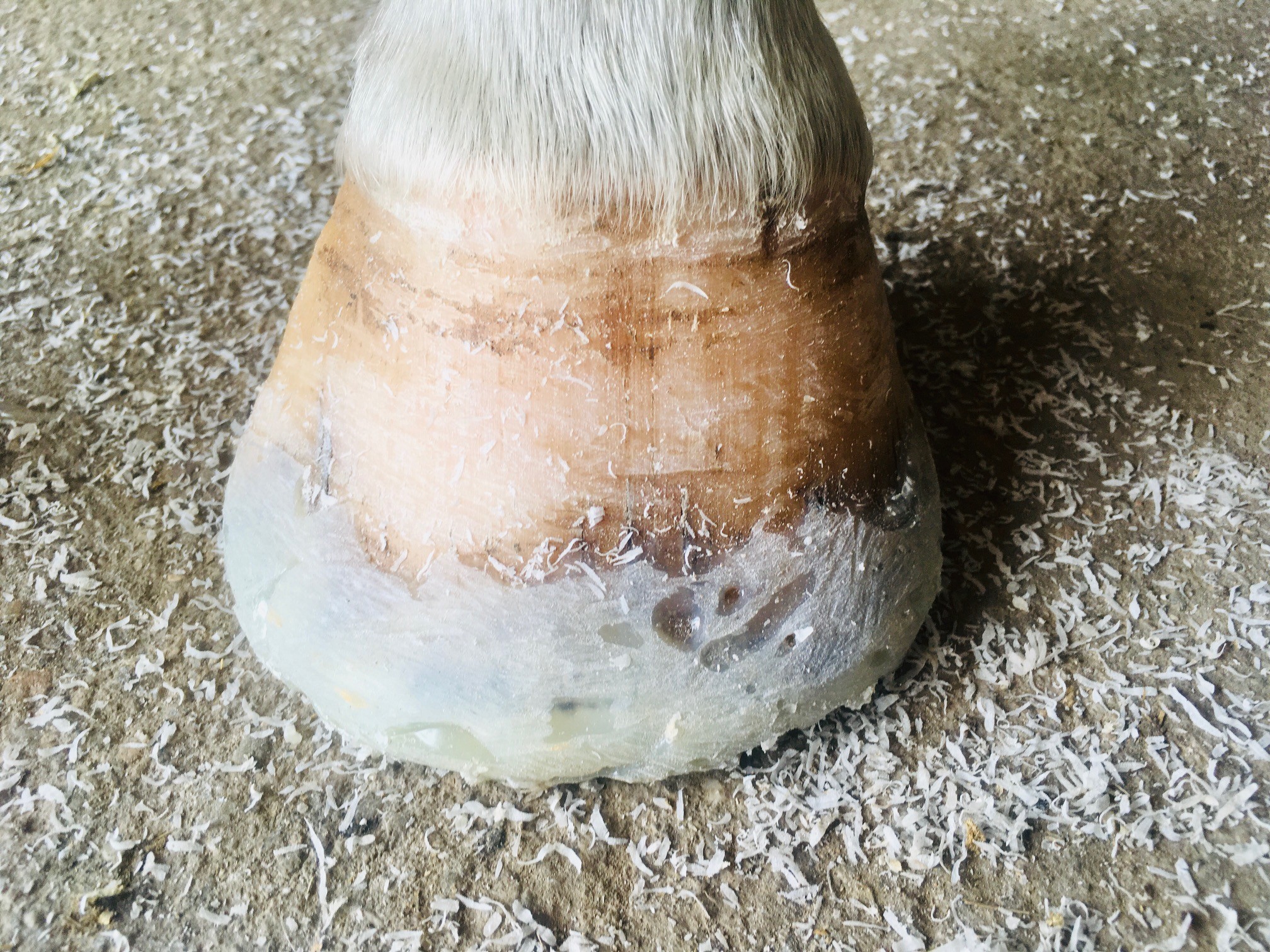 Mogę zrobić, jest aktualnie bezpośrednio po rozczyszczeniu, przy czym do tej pory była od września zeszłego roku podkuwana regularnie. Co jakiś czas musimy ją rozkuć, bo kopyto wolno rośnie, jest kruche i ogólnie wbija się praktycznie w te same dziury po podkowiakach , co jeszcze bardziej je rozwala. Dlatego na ten czas potrzebne mi są jakieś buty.