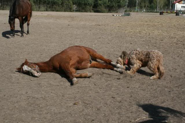 Dawno mnie w tym wątku nie było 🙂 W niedziele moj Rudy był na padoku ze swoim kumplem, 2 letnim ogierem ślaskim 🙂 O dziwo lubią sie nawet. Miziaja sie przez płotek, Pinio nie musi pokazywac ze jest ważny, bo Klakier od razu na poczatku okazuje uległosc, wiec jest cisza i spokój 🙂Oczywiście sa oddzielone płotem od siebie, bo pewnie skonczyło by sie to jednak nieciekawie. Staly cały dzien na przeciwko siebie i strzelały głupie miny 🙂