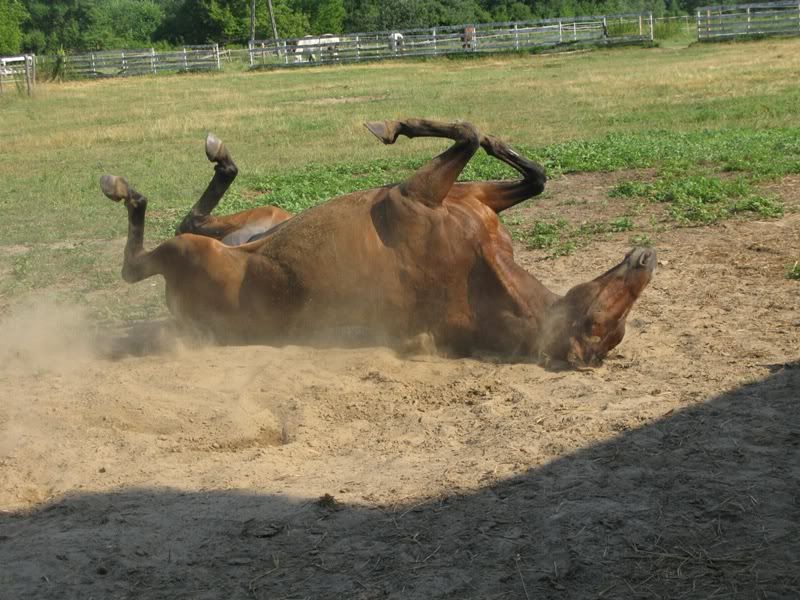 Ja miałam dzisiaj "super" dzień w stajni. Na dzień dobry przy bramce od pastwiska przewrócił mnie Gil kujki, po czym przegalopował mi po kostce. Krew przeciekła mi przez skarpetkę, kostka cała poraniona i strasznie spuchnięta - mam nadzieję, że nic mi się większego nie stało. Nie miałam nawet czasu z tym nic zrobić, bo się spieszyłam na trening. Trening beznadziejny, koń nie miał siły, ja nie wzięłam bata i miał w dupie moje łydki. Płoszyć się miał siłę i parę razy by mnie wysadził w drodze do stajni. Ja pierdzielę, przerzucam się chyba na rower, bo myślałam, że mnie coś strzeli z tymi końmi dzisiaj. GRRRRRRRR!!!! Maleństwo też dziś pechowo, ale dobrze się wszystko skończyło na szczęście 🙂
