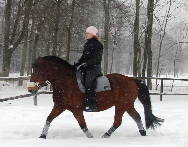 Dziś miałam rewelacyjną jazdę rekreacyjną 💃 Wyłącznie na dworze. Cieplutko było i ślicznie, śnieg mięciutki. Występowałam (tu są jeszcze problemy 🤔), rozkłusowałam. Potem dużo kłusa na dużej ósemce. Potem galop: pół placu, zmiana nogi z przejściem do kłusa, pół placu. Sporo. Bezbłędnie 💃. Odrobinę odkłusowałam i... pojechałam na spacerek nad jezioro 💃 Taki pół-teren, bo w ramach ogrodzenia. Wszystko przy spokojnym towarzystwie mojej psicy. Czułam się... jak "biały człowiek". Uwielbiam subtelne konie! Jedynie mały problem wystąpił, gdy połać śniegu gruchnęła z dachu, ale Perełka szybciutko się uspokoił. Cywilizuje się z dnia na dzień. Nadal boję się zakochać się w nim bez pamięci, ale chyba już przepadłam 😡