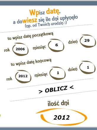 Nie pytajcie co mną kierowało ale wklepałam sobie w pierwszy dowolny suwaczek datę od kiedy jestem z B. by sprawdzić ile dni jesteśmy razem i wynik mnie powalił. 1 stycznia 2012 roku jesteśmy razem dokładnie 2012 dzień ! 😀 😵
