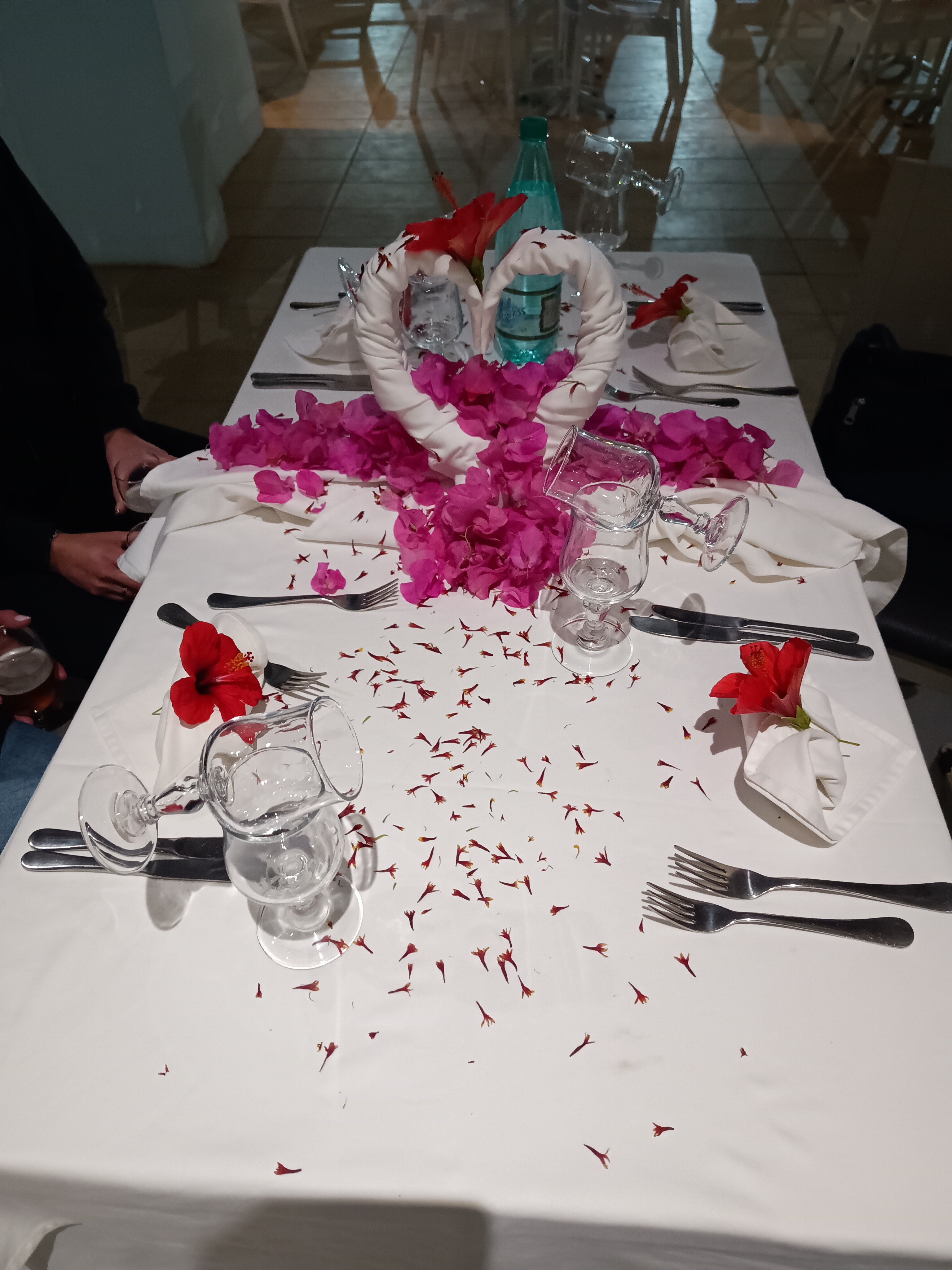 Przedostatniego dnia kelnerzy przygotowali nam stolik jak dla nowożeńców 🙂 jako jedyne, od drugiego dnia pobytu miałyśmy swój stolik, na którym stało już nalane czerwone wino i była cała zastawa 🙂 (pozostałe stoliki były puste 😉 )