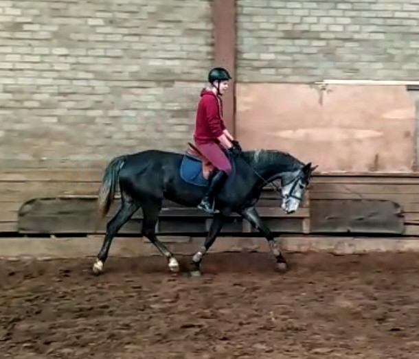 Znalazlam dla porownania fotki na innych koniach w identycznej fazie ruchu i ten laciaty ma 170cm (zmierzony na moich oczach) a jakos 10cm miedzy nim a Fly ani nie widze, ani nie czulam. A siwa ponizej jakies 158 i to faktycznie daje efekt dziewczynki co dawno wyrosla z ukochanego kucyka 😅 chociaz o dziwo ten kon bardzo fajnie pode mna chodzil, zwlaszcza jak na mlodziaka, no ale w zyciu bym go nie kupila dla siebie.