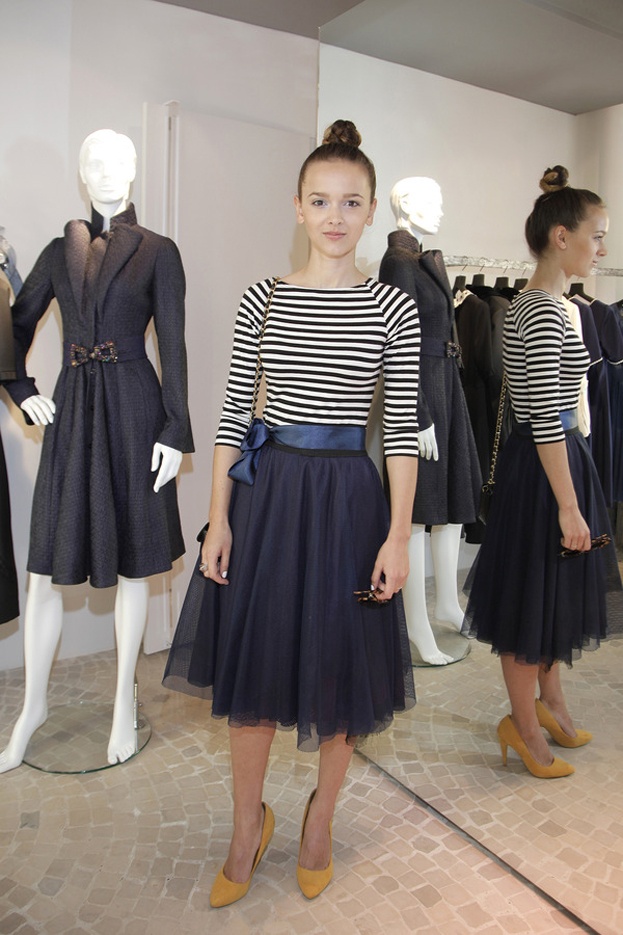 dobrze by wygladala z bluzka koszulowa albo z zabotem wpuszczona do srodka - na elegancko, albo z obcislym topem na ramiaczka i jakims duzym kamieniem na szyi na codzien.