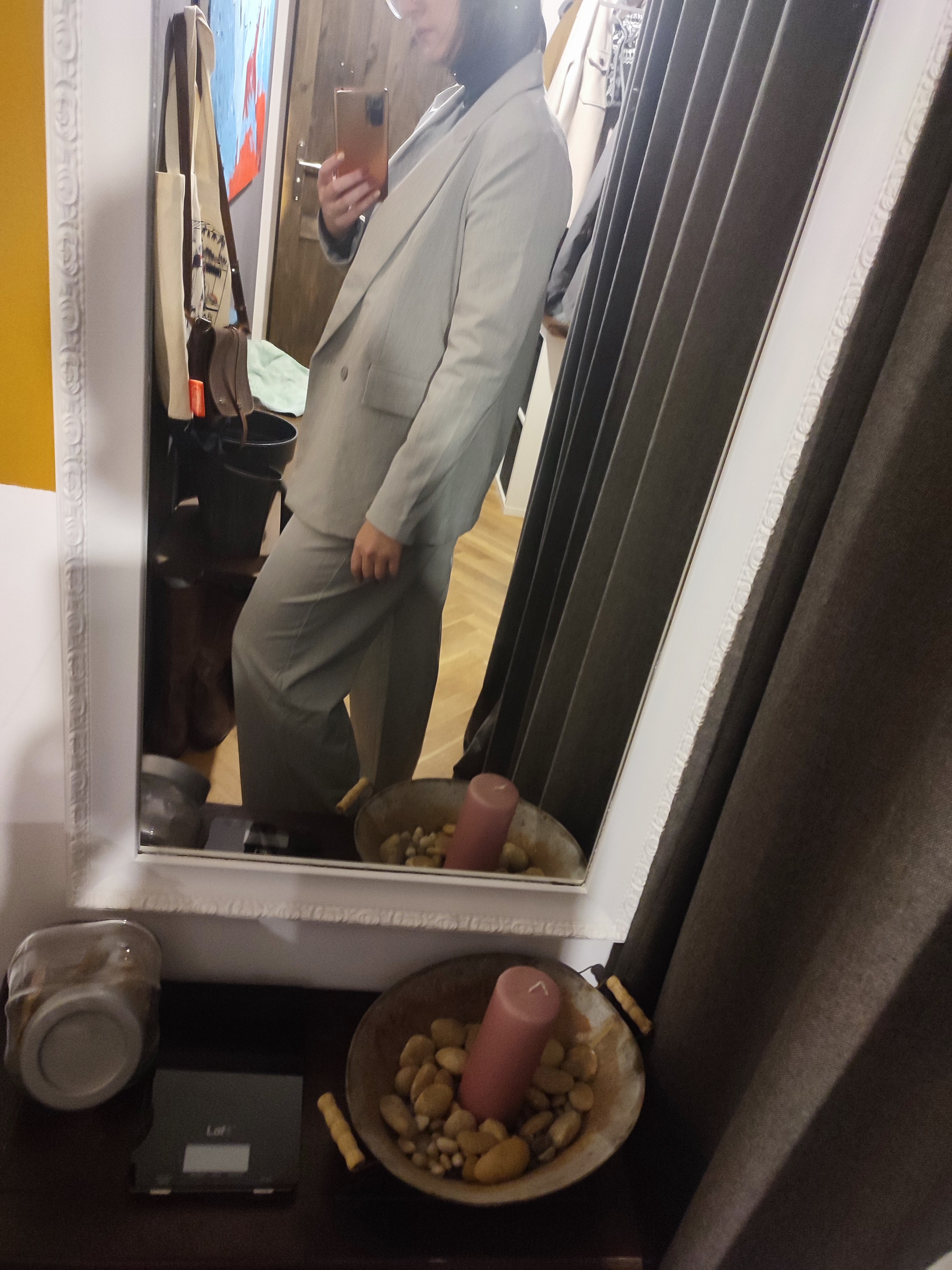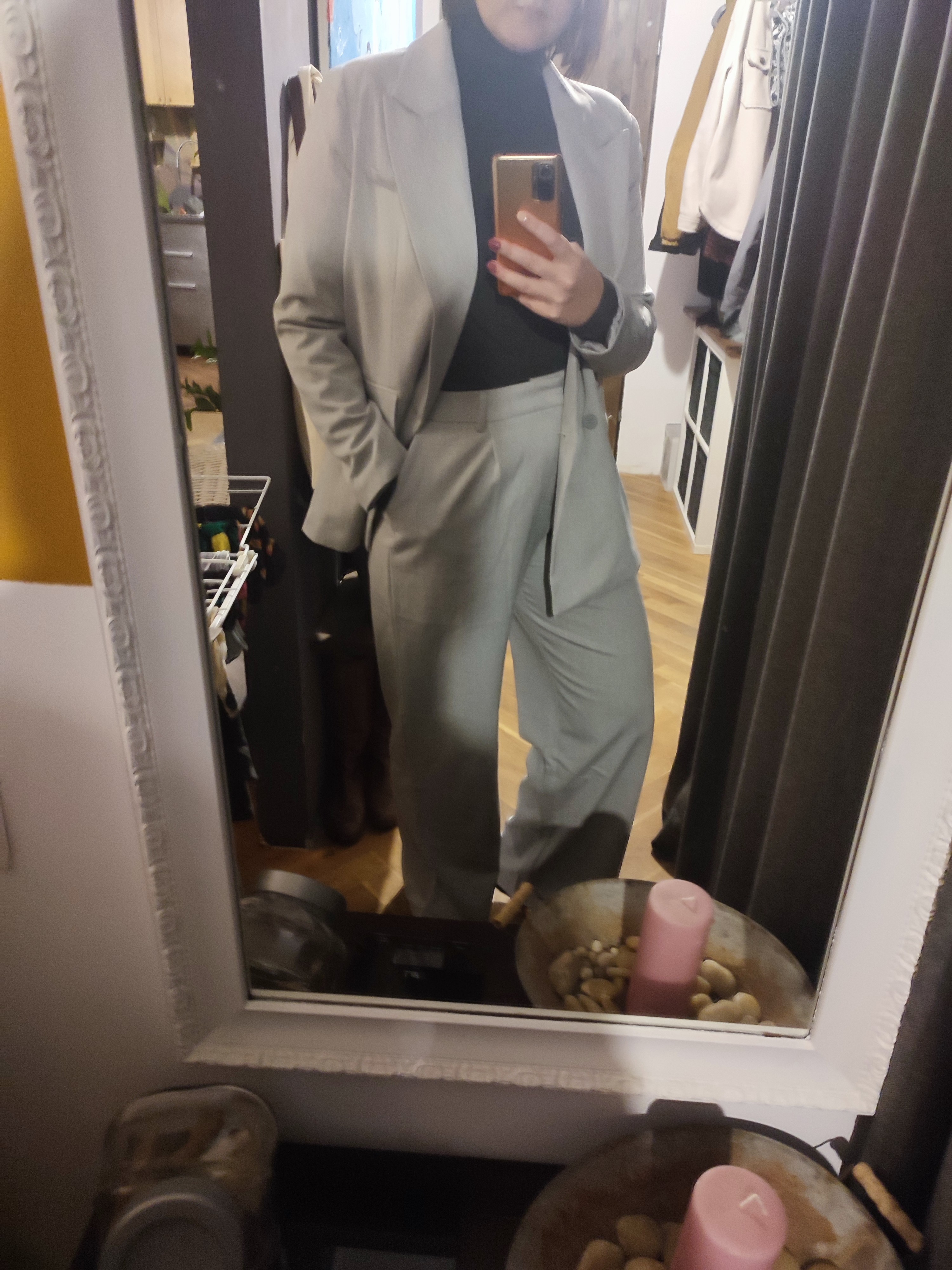 Co do garniaka - jak już bylamy bliska porzucenia poszukiwań i albo odpuszczenia całkowicie albo skierowania się ku beżowym - znalazłam zupełnie przypadkiem z Reserved! Nogawki mogły by być ciut ciut dłuższe ale no, życie. Są za kostkę więc i tak jestem bardzo kontent. Teraz tylko golfik w tym samym odcieniu i mój dreamoutfit będzie ready! Garniaczek polecam. Wygodny, materiał ma lekki melanż, jest nieśliski, niebłyszczący, z delikatnymi poduszkami na ramionach. Lata 90' vibe
