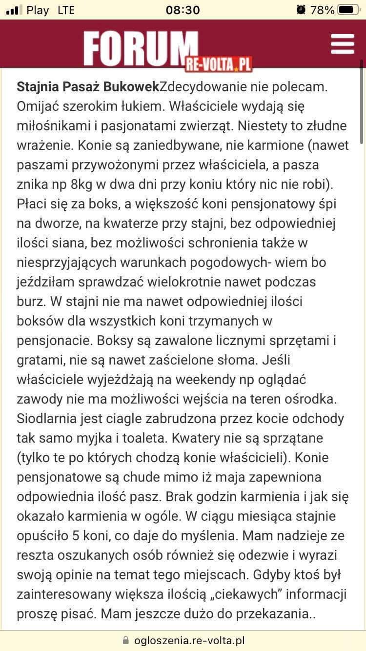 Od listopada stajnię przejęli nowi dzierżawcy. W związku z tym, że staliśmy tam u poprzednich właścicieli- nowi zorganizowali spotkanie, na którym zapewniali nas, że stworzą tam koński raj z super sianem i świetnymi warunkami dla naszych dzieciaków. Mimo gorszych warunków na dzień dobry cena pozostała taka sama, zgodziliśmy się na to i przymknęliśmy oko na wiele rzeczy, bo wierzyliśmy w ich dobre chęci. Po miesiącu poza wyremontowaniem socjala, który potrzebny był tylko im i zamontowaniem światła na hali i placu nie wydarzyło się nic. Ale nie to było najgorsze. Siano, które podawali koniom było koszmarnej jakości - spleśniałe i pełne bakterii. Jedna z koleżanek zrobiła badanie laboratoryjne- ilość drobnoustrojów była NIEPOLICZALNA, a pleśni było tyle, że była to po prostu trucizna. Wszelkie nasze prośby o lepsze siano były zbywane. Nowy dzierżawca ciągle kłamał i manipulował faktami. Podczas mrozów zostały zakręcone zawory z wodą, więc konie dostawały wodę w wiadrach. Niestety po kolacji po godzinie 18.15 wyjeżdżali do domu nie sprawdzając czy konie mają co pić. Wszyscy pensjonariusze dbali o swoje konie nawzajem i pisałyśmy do siebie kto kiedy będzie żeby móc zadbać o konie. Po około miesiącu z pensjonatu wyprowadziło się kilka koni, teraz kolejne 5. Obecnie nie ma tam już żadnego pensjonariusza, z tego co wiemy mają w planach robić tam rekreację- mają swoje 2 konie. Naprawdę nie polecam tego miejsca, zajmują się tym ludzie którzy nie dbają o konie i nie interesuje ich dobro zwierząt. Bywały też sytuacje, że stajenny nie dojechał z samego rana i konie były karmione po 9, co skutkowało też tym że mój koń dwa razy zaplątał się nogami w siatkę i na szczęście inna pensjonariuszka była akurat obecna i pomogła mu się uwolnić. Jeśli ktoś chciałby więcej szczegółów zapraszam na priv, mam więcej zdjęć, screenów itd.