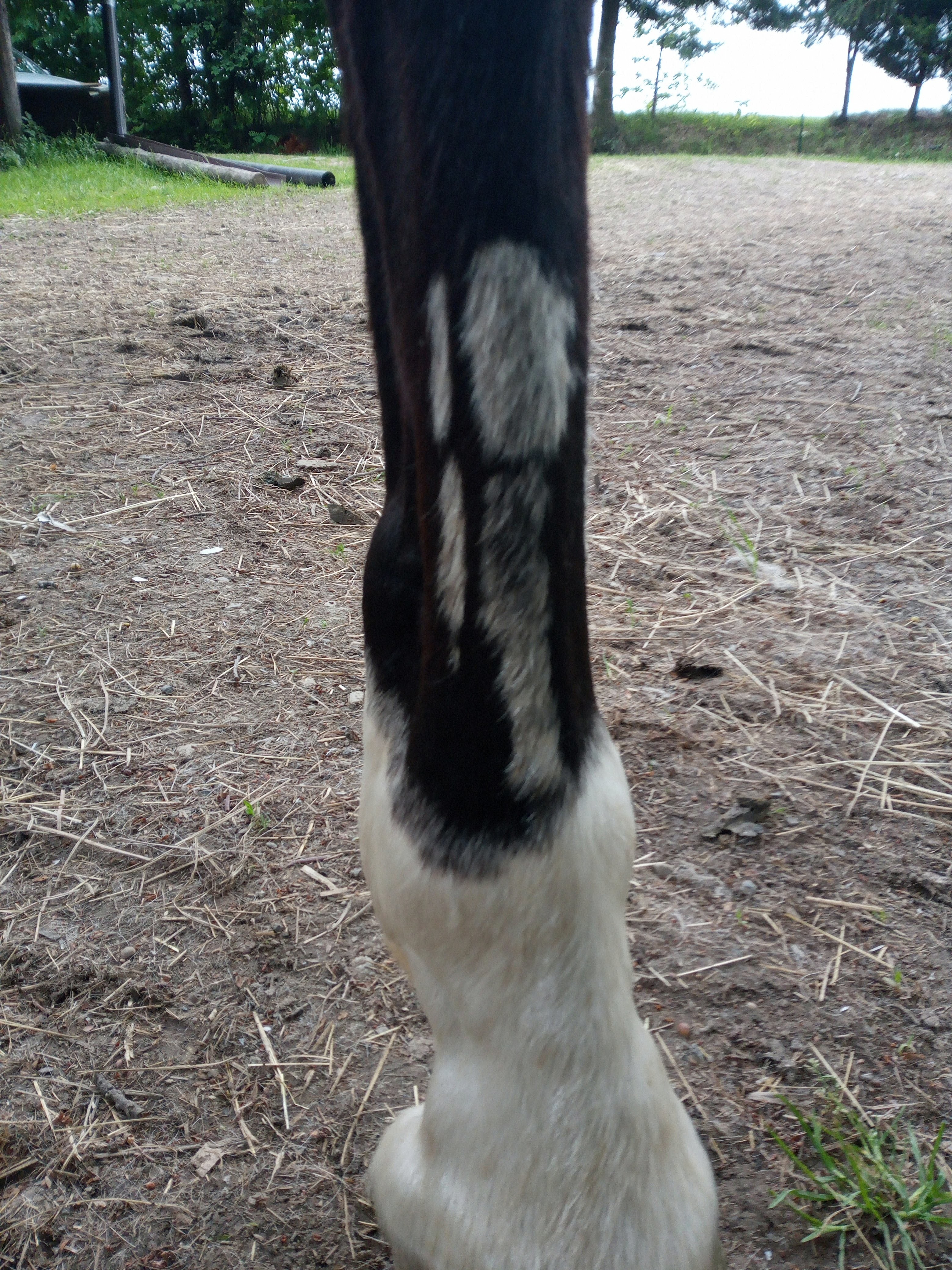 W poprzedniej występowały opoje, dość duże na tylnych nogach po staniu w boksie, nie musiał całą noc, wystarczyło kilka godzin. Teraz opoi w ogóle nie ma, za to doszło do tego co widać na zdjęciu. USG zrobione, RTG zrobione, ścięgna czyste, kościec idealny. Wylany płyn z torebki stawowej. Zalecenia 2 tyg smarowanie maścią z dużym stężeniem heparyny, nie ograniczać ruchu, potem kontrola i pomyślimy jeśli nie pomoże.