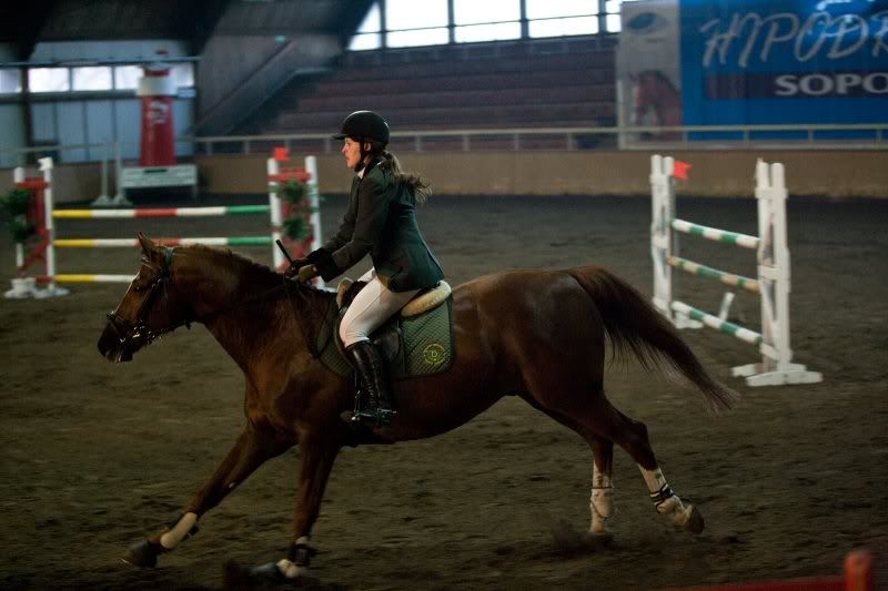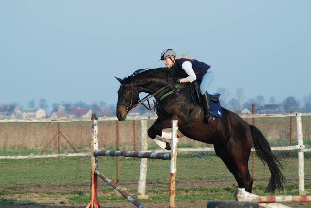 To zdjęcie( sorki za jakość z filmiku wyciełam) z wjazdu w linię na 5 foule,widziałam że będzie daleko więc postanowiłam rozjechać do przodu(gdybym zaczeła dziubać to mogło by się skończyć stopą.) widać,że zostałam trochę za ruchem konia ale gdybym przed odskokiem wyszła do przodu to pewnie całowałabym matkę ziemię, bo Złoty woli się zatrzymac niż skoczyć i zrzucić.