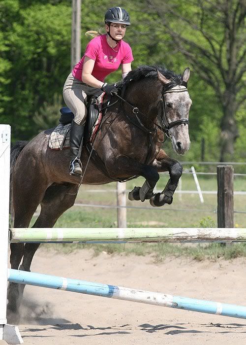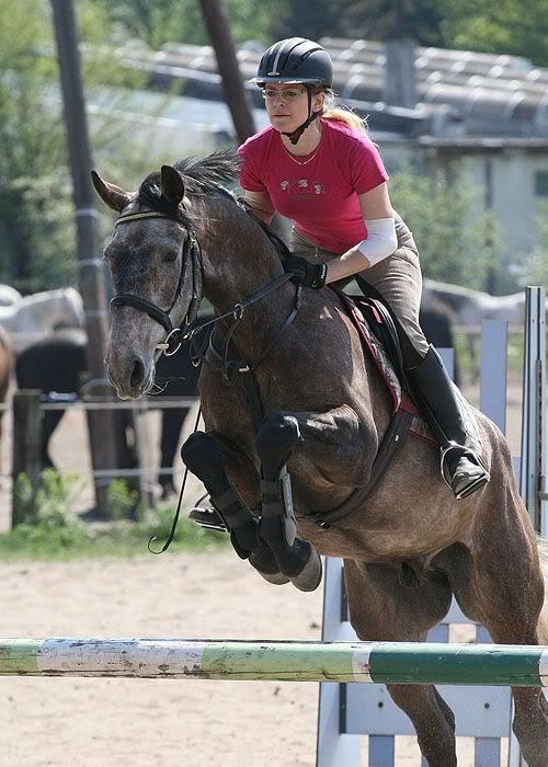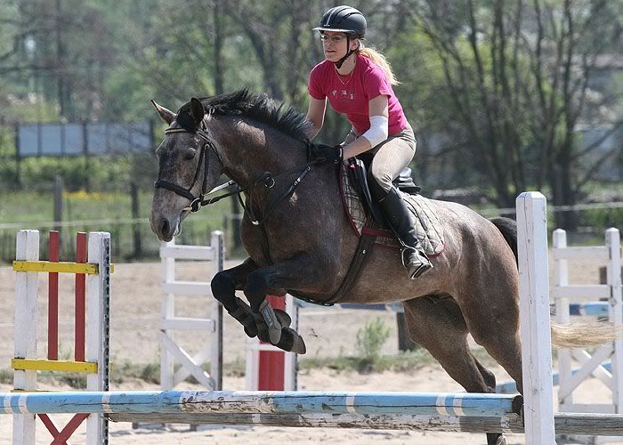 No na treningach jest super, ladnie, rowno idzie, czasem tylko jeszcze na przodzie wisi jak sie rozciagnie po skoku i potem ciezko mu zebrac sie do kupy i podstawic. Generalnie nie napala sie i nie nakreca, dojezdza do przeszkody i z odpowiedniej odleglosci robi odskok. Problem jest na zawodach. ja przyzwyczajona do spokoju, nagle na starcie czuje pod soba dynamit, ktory ciezko jest dobrze poprowadzic.