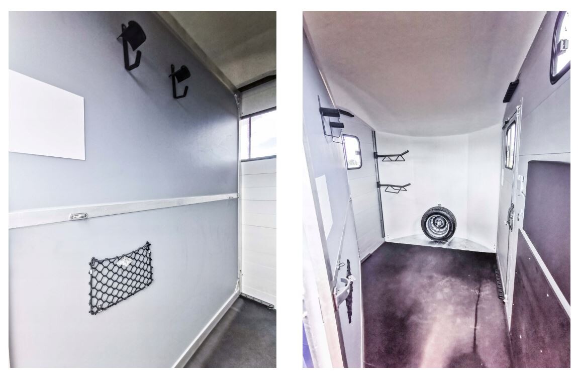 Mam nową przyczepę, z siodlarnią wchodzoną do środka no i mam tam 2 wieszaki na siodło, 2 na ogłowie i to tyle. Jak zapakuje tam pół domu które zabieram na zawody to mi będzie wszystko latać ( widły , taczka, sprzęt w torbach itp), więc nie wiem jak to zoorganizować.