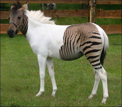 Co do zebry przypuszczam, że jest to po prostu mieszanka konia o maści cremello i zebry - zwany zebroidem. Zebry mają całkiem proste pyszczki 🙂 Coraz więcej takich miksów robią: