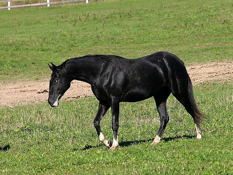 1) koń cremello przekazałby tylko jeden alllel C[sup]CR[/sup]. Potomstwo z takiego połączenia miałby rozjaśnione oczy (bursztynowe) i pasy koloru takiego jak koń kary przydymiony (ang. Smoky black)