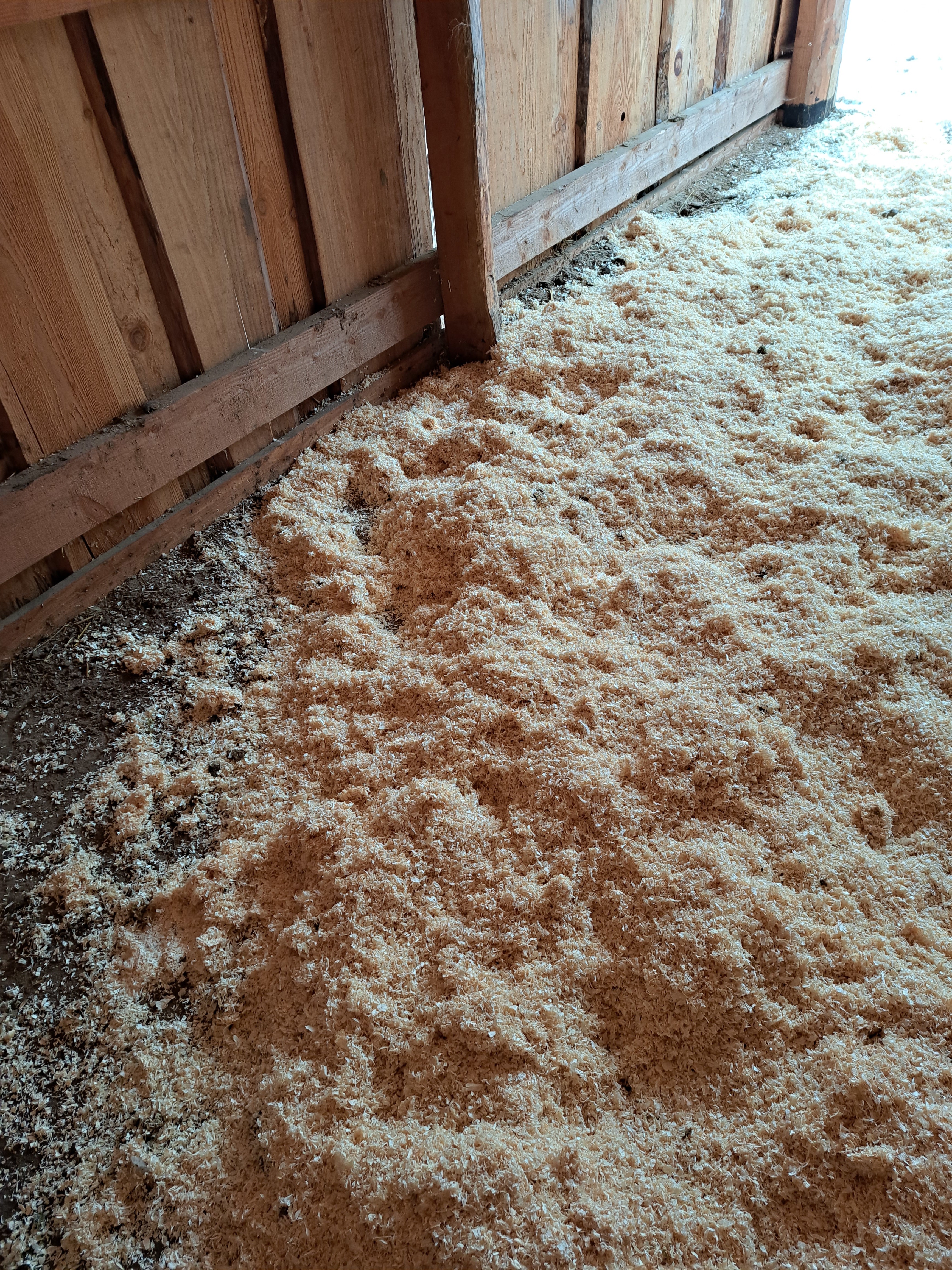 Zrobiłam zdjecie maty, chociaż własciwie nic nie widać. Konie naniosły na nią piasku, więc nie widać dziurek ( poza jedną ). Siki spływają, syfu nie ma. Trociny sa po sprzataniu i wygladają tak zawsze, nawet jak na zewnatrz błoto i woda stoi, bo nic do domku nie wpływa. Sprzata mi sie ta wiatę tak samo jak boks. Moze nawet lepiej, bo w boksie jednak mocz nigdzie nie spływa.