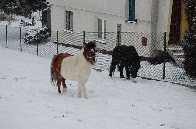 Frania - niesamowity ten kucyk i ta grzywa.... Pięknie wygląda na dwóch ostatnich zdjęciach🙂 już nie mogę się doczekać aż moja chudzinka będzie tak wyglądać. Narazie ma duży brzuszek od sianka a reszta jeszcze drobniutka. Nie ma szyi klaty zadka 😕mam nadzieje że jak zrobi się cieplej to szybciej nabierze ciałka i zgubi to długaśne futro z pod którego go nie widać i zbiera się na nim całe sianko jak je z dużymi końmi. Wklejam zdjęcie z kozunią pierwsze "baran baran buc" i drugie kozunia pozuje🙂 czuje się trochę jakbym miała ekipę z filmu : " Zebra z klasą"