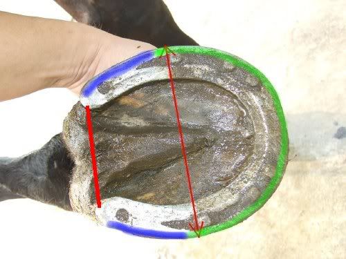 Najszersze miejsce kopyta powinno być z grubsza tam, gdzie kończą się ściany wsporowe - to będzie mniej więcej na granicy zielonej kreski i niebieskiej kreski.