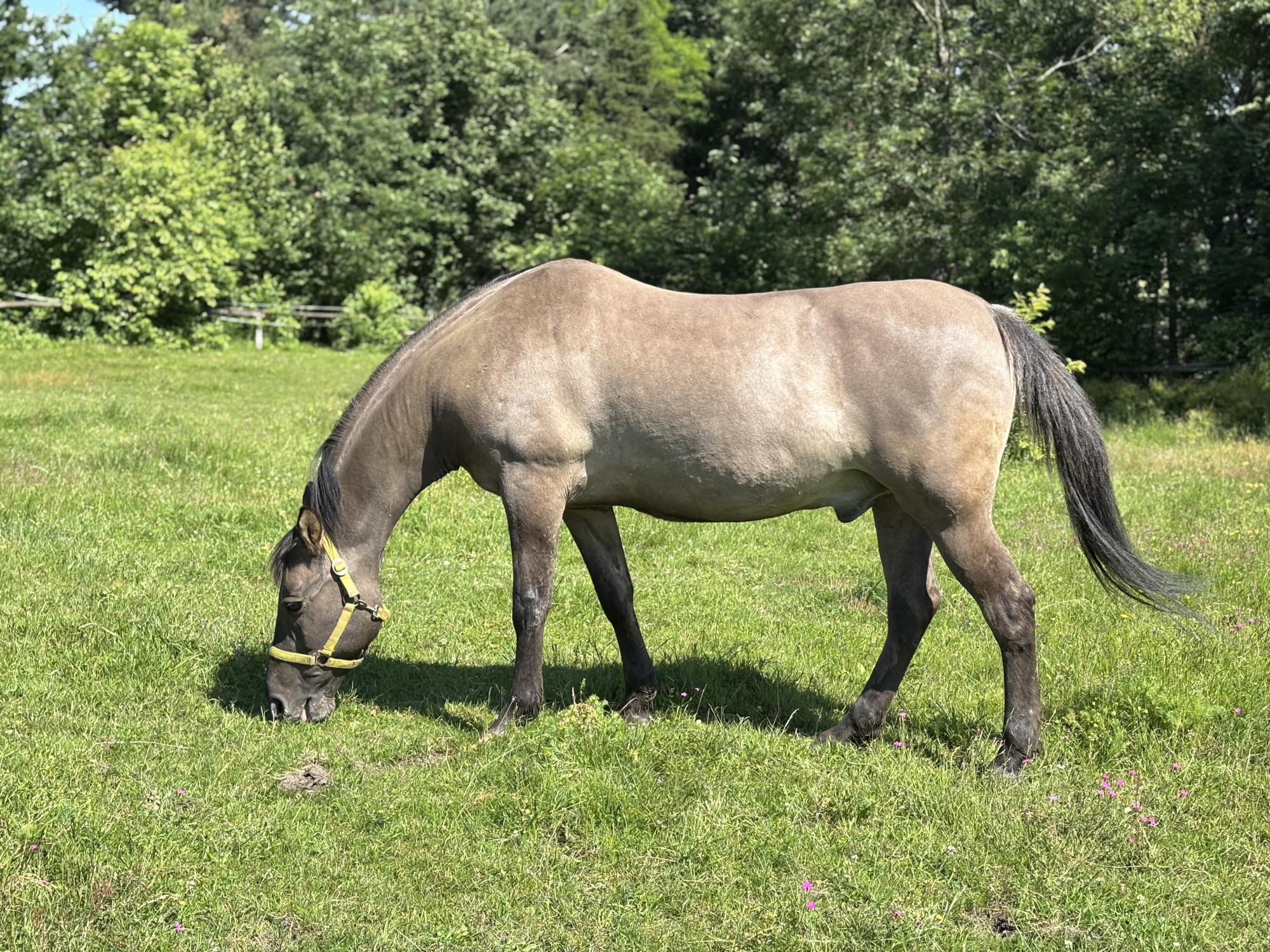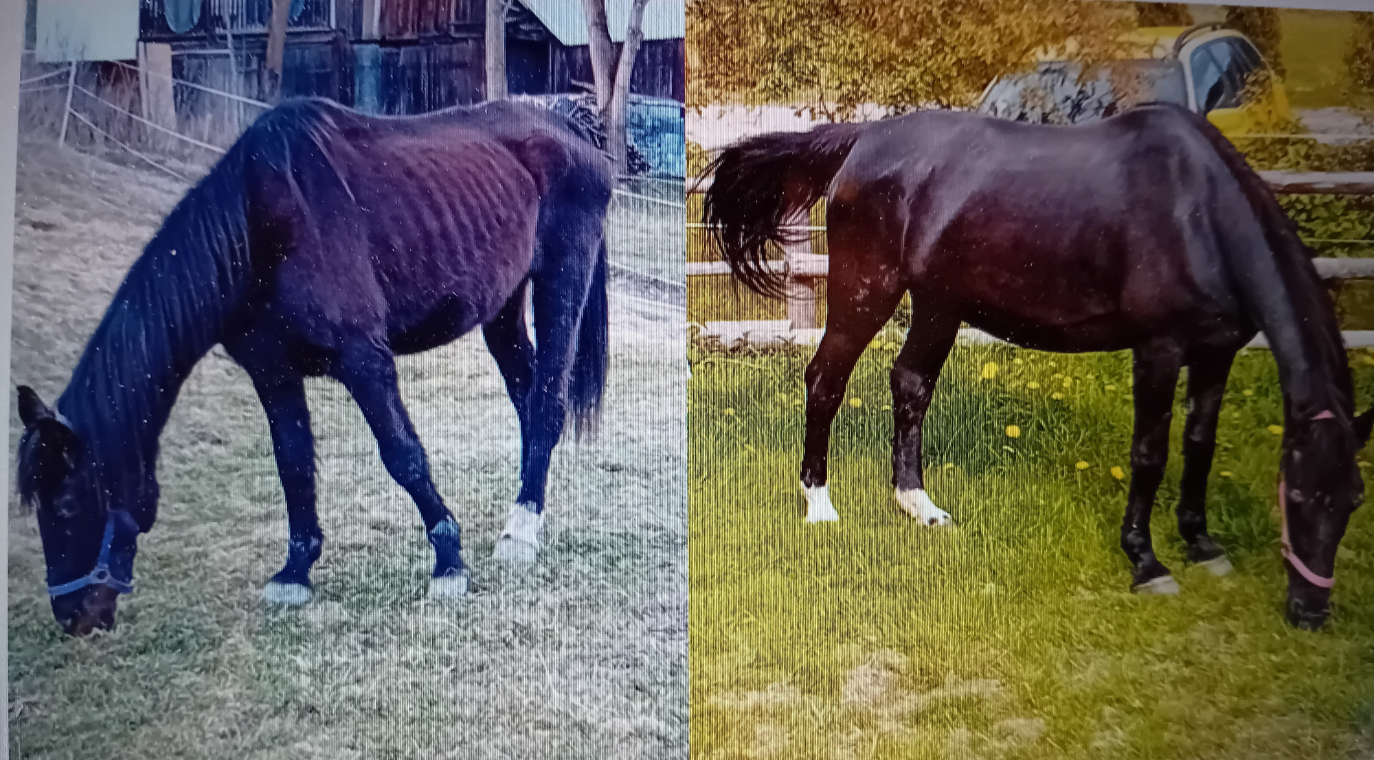 Sankaritarina Już wcześniej tłumaczyłam. Klacz 25 lat, stajnia wolnowybiegowa, nie radziła sobie w zimie. W lecie na trawie było ok, ale w zimie dostawała za mało treściwego (chociaż pasza była -ale w magazynie), a siana nie mogła jeść mimo regularnych wizyt dentysty Nikt nie zauważył, ze tylko żuła siano, robiła kulki i wypluwała, nie mogla ich przełykać. Teraz u mnie też tak ma, ale dostaje 4 razy dziennie wiadro paszy z owsem, jęczmieniem, kukurydzą, trawokulkami, itd.Do tego ten Foran Muscle chyba też pomógł, bo bardzo szybko się pozbierała.Jeszcze jedna fotka porównawcza - w kwietniu i teraz.Oczywiście trawa też zrobiła swoje😁 Nie wiem dlaczego fotka wyszła bokiem