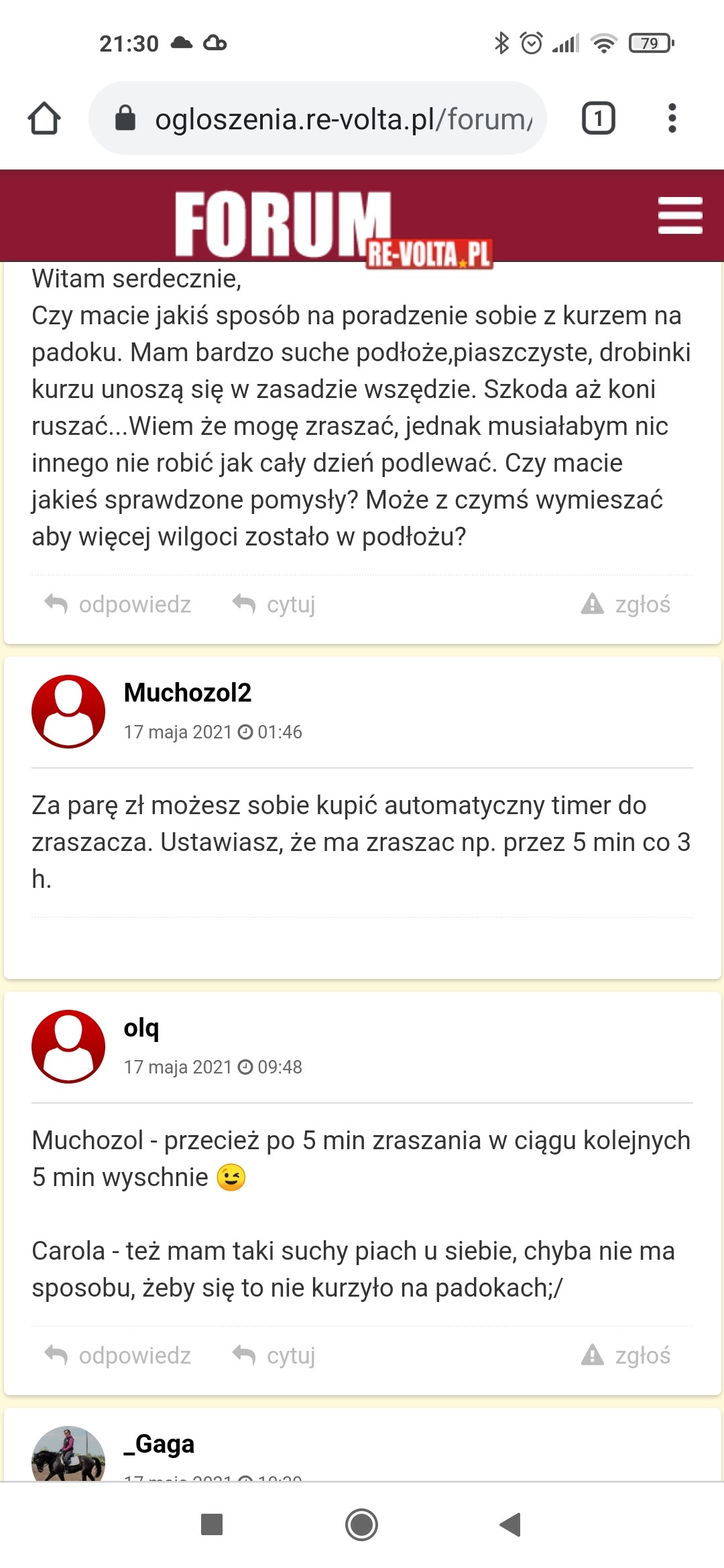 <b>olq,</b> a możesz przybliżyć efekt tych trocin? Podlewasz za każdym razem jak chcesz jeździć czy jest jakieś dłuższe działanie np. Raz w tygodniu podlejesz i utrzyma się efekt przez tydzień. Ja niestyeu przy pracy to wpadam do stajni i mam tylko czas na to aby ruszyć konia. Podlewanie codzienne jest nierealne... Carola,