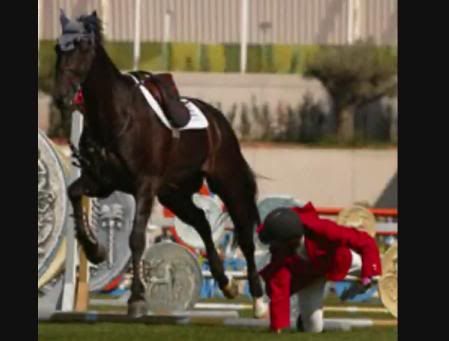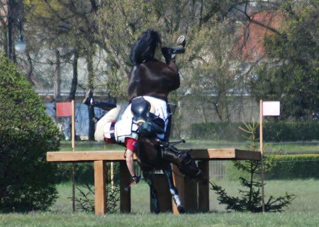 Jednak tu zawiniła raczej zawodniczka, bo źle najechała na przeszkodę ( źle wyliczyli fule ) koń jej się wyłamał, a ta mu batem, koń wystraszony stanął dęba, a ona go szarpnęła za wodze i razem się wywrócili.
