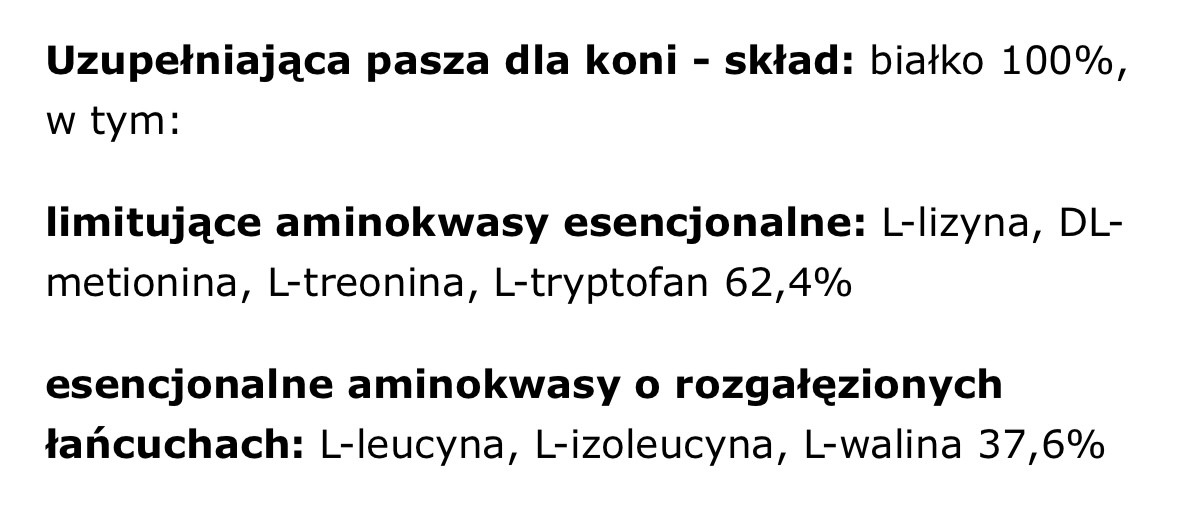 Czyli przykładowo ten amino pure dromy bądź samodzielnie sporządzoną mieszankę aminokwasów limitujących (lizyna, treonina, metionina). Konie zazwyczaj nie mają niedoborów białka samego w sobie, wręcz przeciwnie - już samo siano w większości przypadków daje nadpodaż białka. Natomiast to białko jest niekompletne i słabej jakości, więc na logikę dodanie aminokwasów, których brak blokuje możliwość wykorzystania pozostałego dostępnego białka powinien rozwiązać Twój problem.