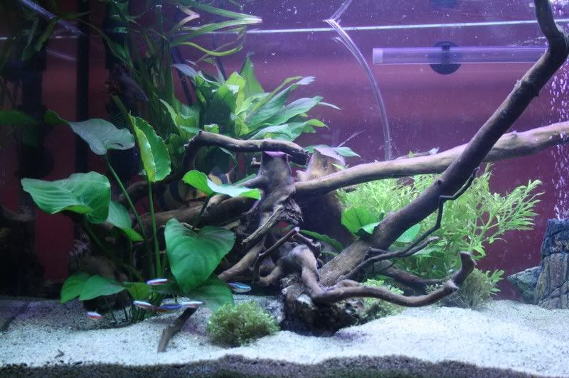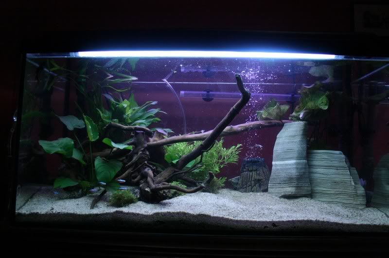 A oto moje akwarium po 3 miesiącach od czyszczenia całościowego 🙂 Grzyba/pierwotniaka sie już pozbyłam definitywnie, glony od czasu wpuszczenia 'glonojada' pojawiają się sporadycznie. Wiem, ze jest zbyt pusto jak na roczne akwarium, ale planuje posadzić jakąś mocną i wytrzymałą roślinność jeszcze, bo glonojad pożera wszystko. nawet taki dywanik, co rosnie na dnie i mech tak samo :/