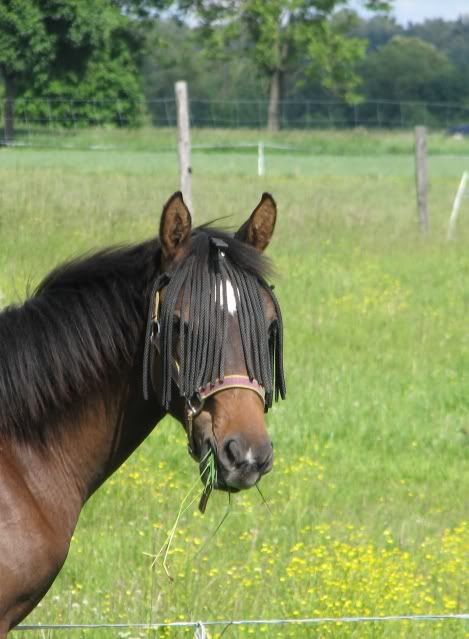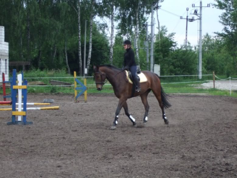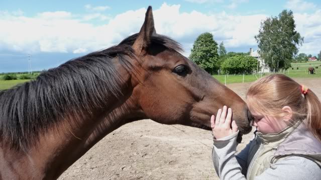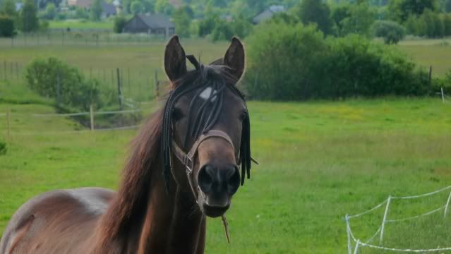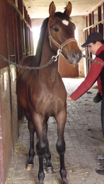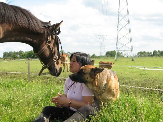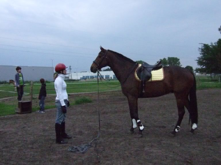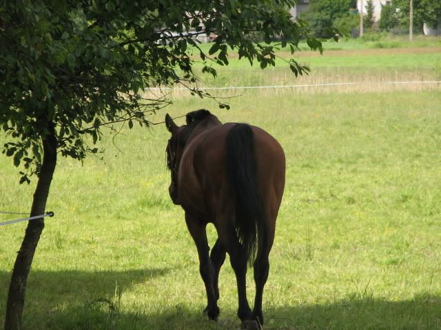 A mój młody mnie dzisiaj zaszokował... Rwał jak głupi, poparzył mi rękę, ze 3 razy mi uciekł i raz prawie wskoczył mi na plecy, z premedytacją... Nie wiem co się z nim porobiło, jeszcze niedawno był do rany przyłóż, a teraz wariuje, wyrywa się... Zwątpiłam dziś na moment, ale w końcu dałam mu się wybiegać aż mu się znudziło i pod koniec udało się wreszcie grzecznie iść w ręce i zrobić ładne 2 kółka w stępie na lonży i nawet grzecznie zakłusować (nasza nauka ruszania w kółko prowadziła to durnego biegania w kółko byle szybciej, bo pani w środku gryzie 🙄. Ale potem nawet grzecznie dał nóżki i grzecznie się poczyściliśmy. Aj moja wina, za mało czasu mu poświęcałam i mi dzieciak zdziczał... Co ta szkoła z ludźmi robi, że na nic czasu nie ma 😵. Teraz nie dam mu spokoju, mam już luz w szkole, to będę codziennie coś z nim robić, czy to czyścić, czy brać nogi, może zacznę się z nim bawić w jakieś przeróżne gierki... Właśnie, czy kto mógłby polecić mi jakieś gry na oswojenie i 'zdominowanie' takiego małego terrorysty? Urósł okropnie i ma już zdecydowanie więcej siły niż ja. Powoli zaczyna robić się nieobliczalny, nie chcę żeby któregoś dnia wskoczył mi na plecy... Dziś gdybym nie odskoczyła na bok to bym przywitała się z jego kopytkami. Może być na pw. Przepraszam, musiałam gdzieś to z siebie wyrzucić... Na deser dam ze 2 zdjęcia z poprzedniej sesji: