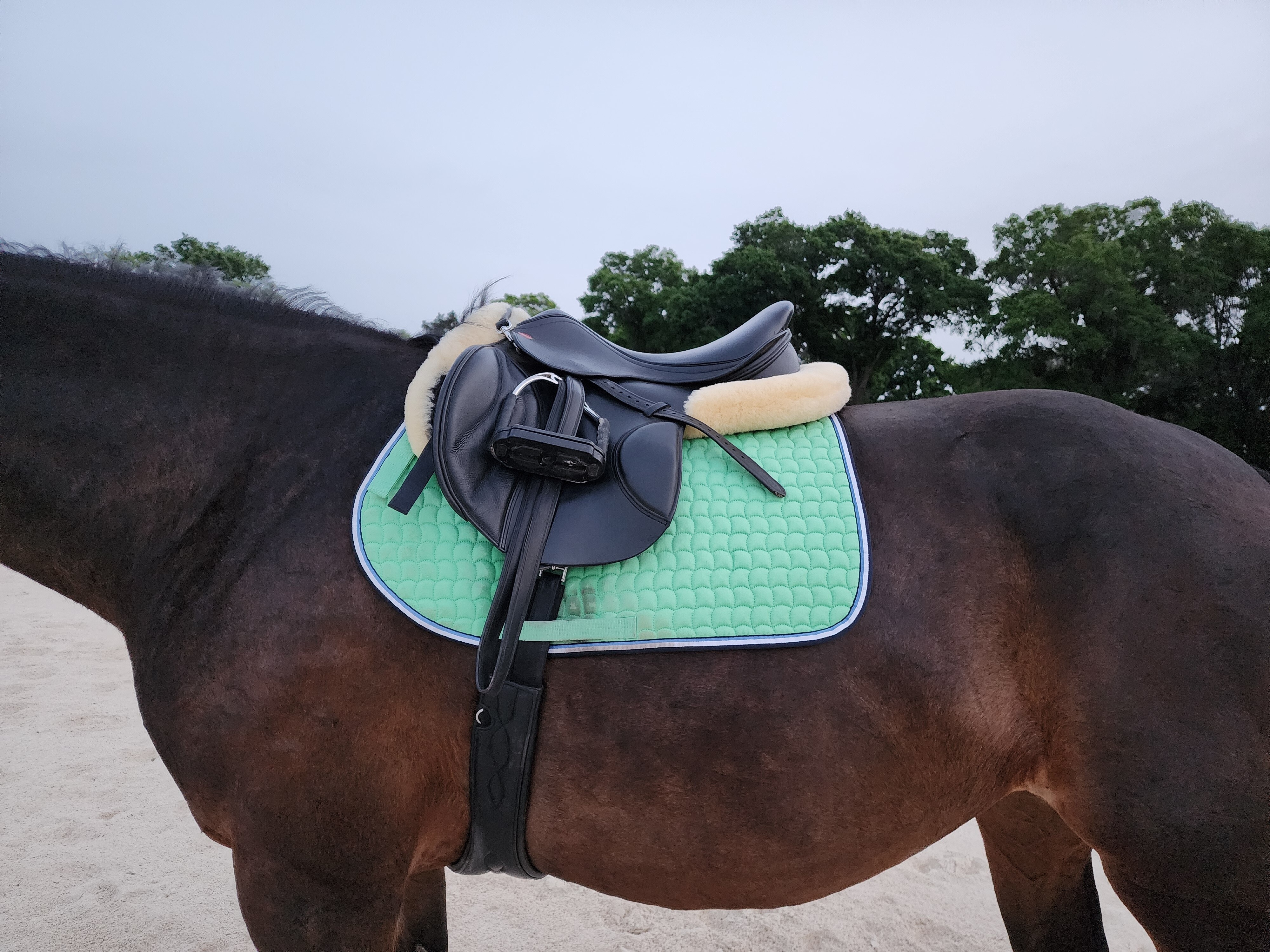 Więc zaczęły się małe schody, żeby zmieścić się z panelami w tym wymiarze przy siedzisku 17,5". Aktualnie zakupiłam Daw Maga 31 cm, 17" (niestety lateks, niedopatrzenie z mojej winy) panele w odpowiedniej długości + korekcyjna podkładka mattesa dopasowana również przez saddle fittera. Nie ma tragedii, ale siodło nadal nie leży "idealnie", podczas jazdy tył siodła niepotrzebnie sprężynuje, przez za szeroki rozstaw łęku. Koń przyjechał do mnie z bolesnym grzbietem, po niedopasowanym sprzęcie, więc tym bardziej chcę wymienić siodło na coś lepszego jak najszybciej.