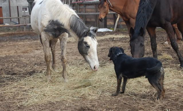 Biega przy nich od kąd miał 3 miesiace wiec sie znają bardzo dobrze , nie wykazują agresji ani on ani konie . Bawia sie , ganiają.