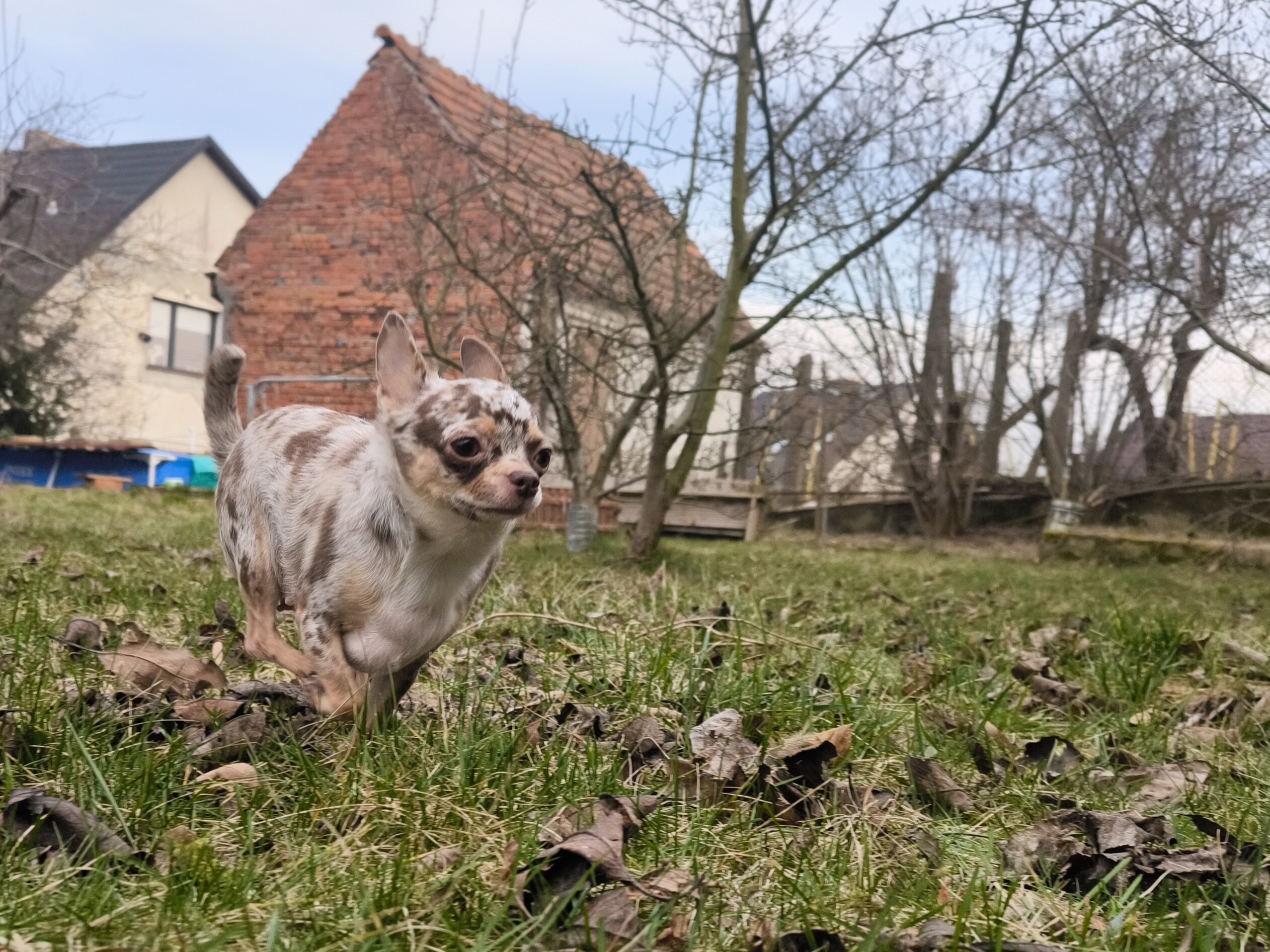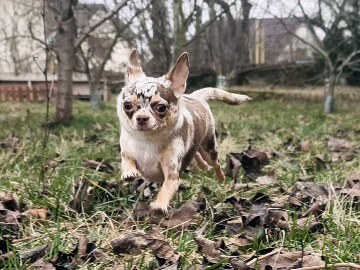 Ta nasza z miotu była ostrożniejsza (hodowczyni w ogóle panikowała, że będzie lękliwa bo się czegoś wystraszyła, a inne pieski poleciały), ale po tym początkowym okresie fajnie się otwiera i jest bardzo dzielna. Jak ją coś wystraszy to nie panikuje, tylko leci do człowieka, ale to coraz rzadziej się zdarza, no i raz się wystraszy, a później już jest spoczko. Poza tym, największy rozrabiaka i najaktywniejsza z miotu. Chętnie cwiczy, szybko łapie, fajnie oferuje zachowania i się nie frustruje. Je okej, bawi sie fajnie, ale wszystkie zabawki są za duze, wiec jako szarpak sluzy skarpetka 😀 Jak jej mówię hasło na trening to sobie hopsa. Ogółem, jest urocza na maksa :P