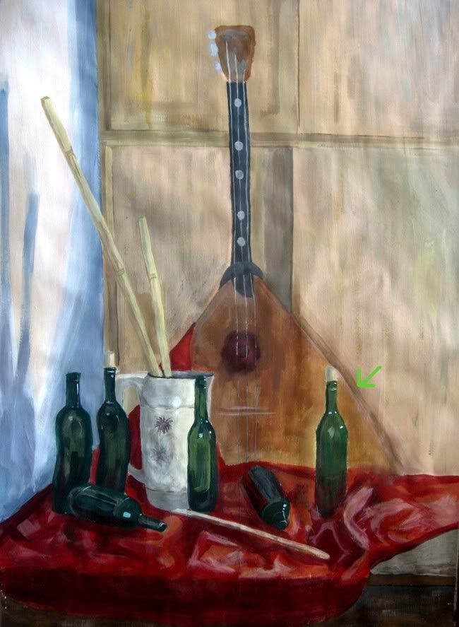 Draperia - koszmar (odpuszczona, po prostu), bałałajka umowna - ale nie o tym chciałam 🙂 To, że "popełnia się" ćwiczeniowo "martwą" nie oznacza, że nie warto pomyśleć. Tu niewiele brakuje, żeby... no, żeby obrazek zaczął opowiadać ciekawą historię: pijane butelki, draperia jak rozlane wino - instrument (miłość) niemal tylko namalowany na tle... i tak najważniejsze cienie zupełnie z boku... Zdecydowanie wolę, gdy artysta "wygrywa" takie rzeczy świadomie, celowo i konsekwentnie. a symboliczne znaczenie... patyczka? cieniutkiego, a dzban taki duży... Janek! uważaj - podświadomość objawia się w sztuce radośnie, szczególnie wtedy, gdy się tego nie planuje 😀