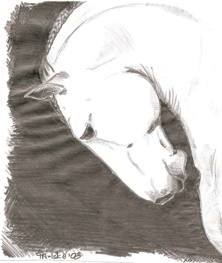 o tym ile się siedziało na pastwisku między końskimi nogami i ile zjadło się bloków na rysowanie mieśni kopyt itd tylko może ten powiedzieć , kto tak jak ja przez kilka lat mniej wiecej od 15 do 20 roku życia biegał ze szkicownikiem pod pachą ... potem sporadycznie bo rysunek zarzuciłam kompletnie , raz na jakis czas brałam kartki do ręki by nie zapomnieć i umieć trzymać ołowek ... ale konie to nie tylko to co uwielbiałam rysować , może i dlatego taka moja natura , bardziej techniczna niż z polotem , bo architektura u nas w domu priorytetem była a więc budynki , perspektywa , za którą Janek , z tą lampka burę niezłą byś dostał , figury przestrzenne i wcale nie rysunek techniczny , której prawie całej grupie robiłam , a własnie ten typowo miejski z zabytkami proporcjami i tym czymś co wynikało z chęci ducha , było dla mnie esencją życia i tego co kochałam najbardziej ... nigdy się nie uważałam za artystkę , jestem kopistką , bo takie były zamówienia , lecz do kazdej z moich prac , starałam się włożyć najwięcej serca i tego czegoś , co nazywam satysfakcją , tak było w wypadku serii z Crazy , i Radka , z Lustiano i zaprzęgówka i kilkoma innymi , które mają to coś , co przyciąga wzrok i ciagle , na nowo każe spogladać i bawić wzrok dominantą , plamą , światło cieniem .... wyczucie kreski , odległości , proporcji to coś czego człowiek uczy się cały czas , a margines błedu zależy tylko od oka tworzacego , dlatego staram się być jak najbardziej zgodna z anatomią oraz z danym zwierzakiem ... a wyobraźnia ? często płata nam figla , bardziej dodając fakty niż je w rzeczywistosci widząc ... natura to wspaniała szkoła życia , dla każdego z nas i do tego drodzy rysujacy serdecznie zachęcam uznajacym moją kopistość dziękuję , innym wykonawcom biję pokłony , za kreski , polot i akwarele , widac że ludziom się chce , bo najgorsza dla artysty jest rutyna i marazm ...