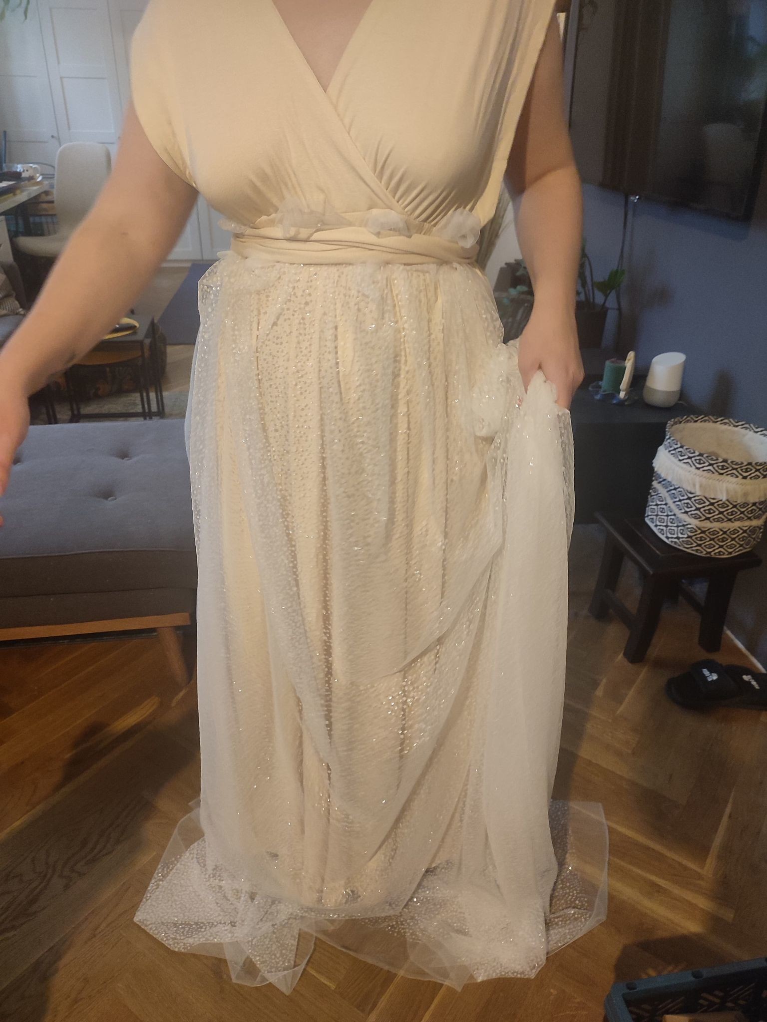 bergerowka, o proszę! ja też poszłam w budżetowe rozwiązanie, dzisiaj powinny przyjść materiały na overskirt (szyfon w kolorze sukienki + brokat) i z letniej sukienki wyjdzie ślubna a potem z powrotem letnia 😀