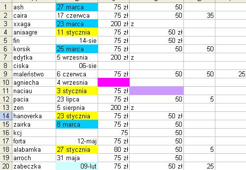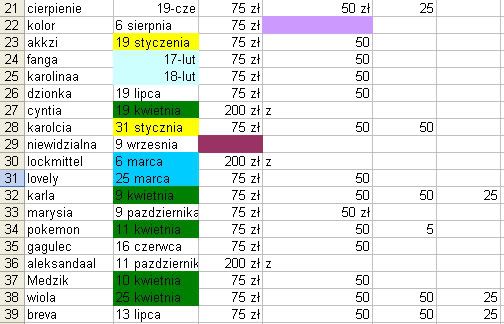 ciska, napisz czy doszła kasa od Naciau i kolowiatru. Jak nie, to lecimy do NIEUCZCIWYCH i już. Kurde, jest koniec kwietnia, prawie miesiąc obsuwy... Btw dlaczego kolwiatru nie ma w tabelce?...
