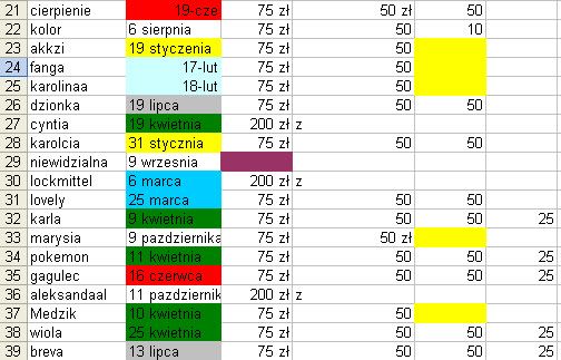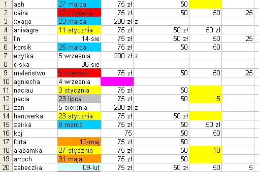 Jutro edytuje tabelke bo nie mam jej na obecnym komputerze nowe przelewy: Medzik 50 zł Niepodpisany od Karoliny Pochodyły 50 zł Cierpienie 25 zł Pacia 45 zł Ash 50 zł Forta 50 zł