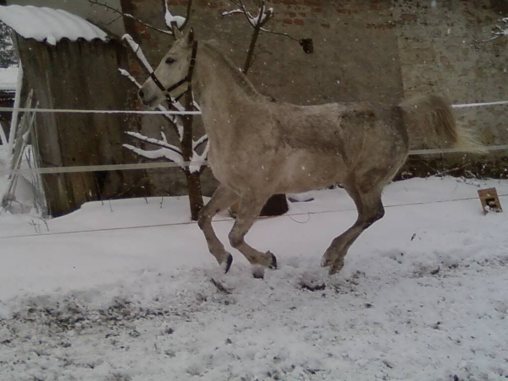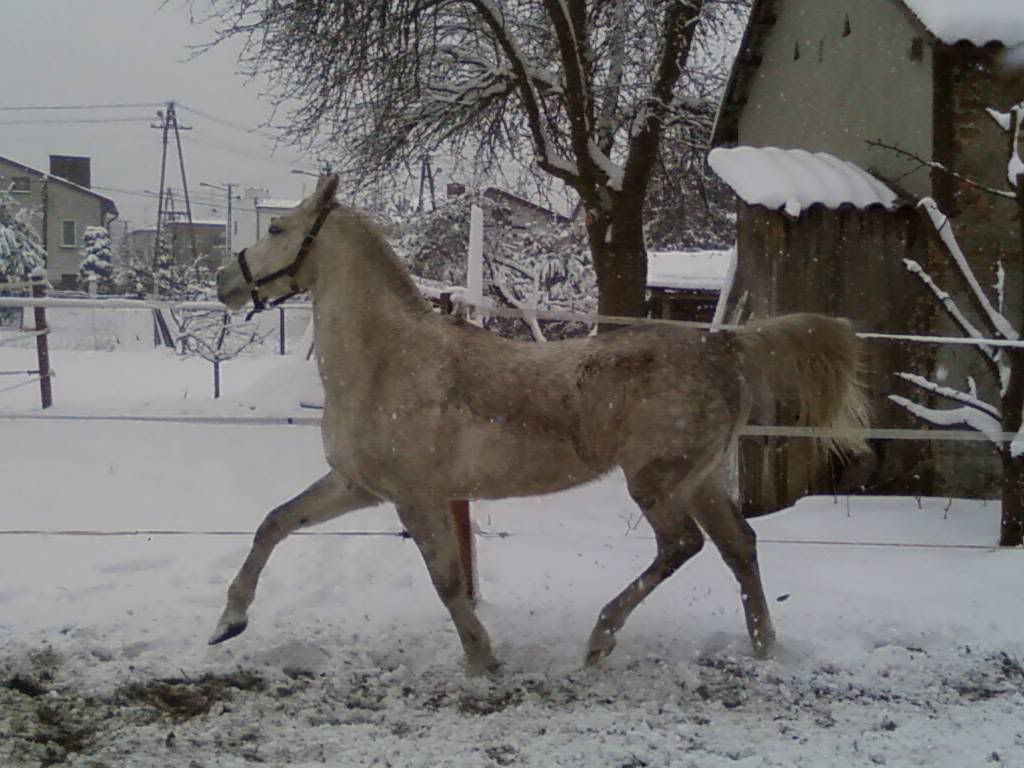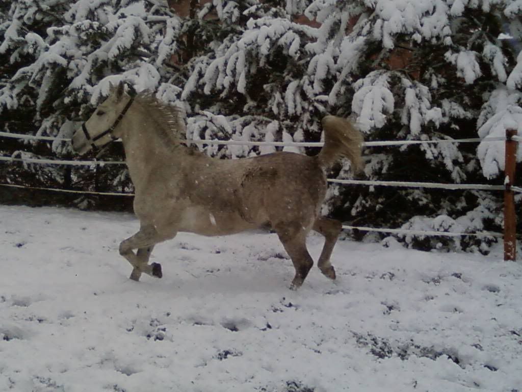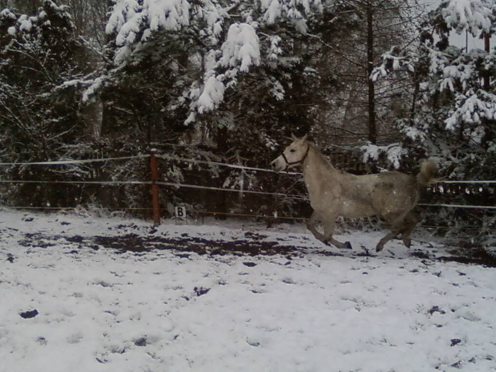 U Nas wreszcie jest śnieg. Siwa jak go zobaczyła..to była pełnia szczęścia i mój dziki lament (czyt. darcie się:"Siwaaa! Uważaj na ogrodzenie! Haaaamuj!Patrz pod nogi!) No ale nic, grunt, że koń zadowolony (a w tym i brudny...Takie urokliwe zacieki się porobiły po tarzaniu)