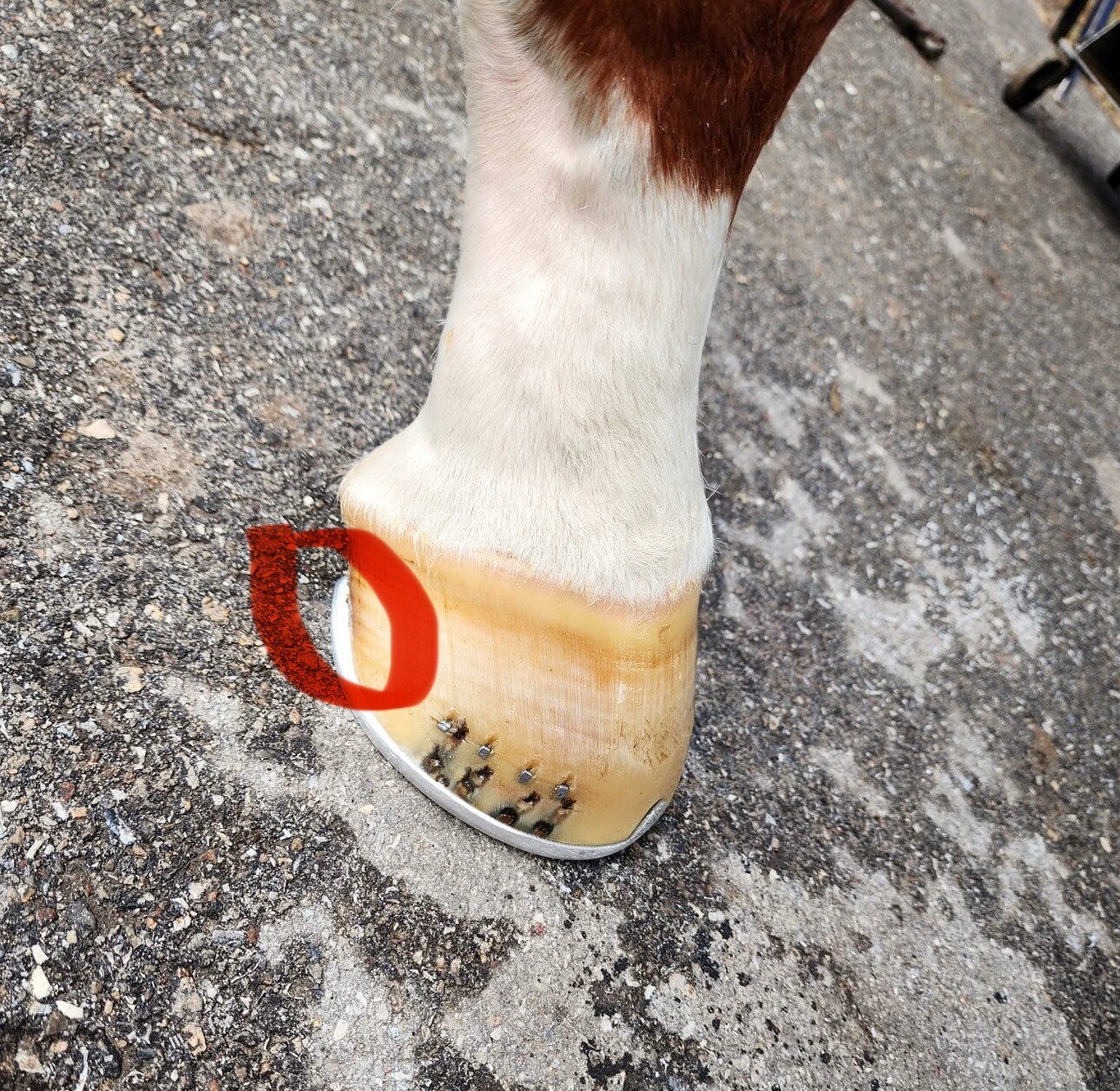 espana, popatrz jeszcze czy z tyłu jak koń stoi jest odpowiednia ilość miejsca na pracę kopyta i przestrzeń do rośnięcia, tam gdzie zaznaczone na zdjęciu (praca tego samego kowala, Gary Gullo Jr.)
