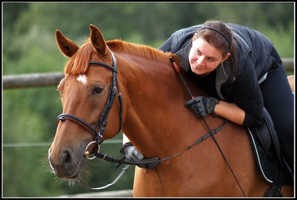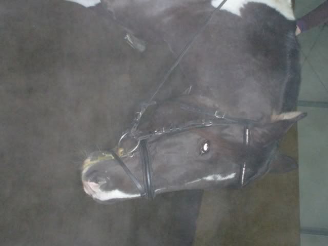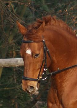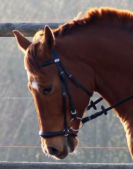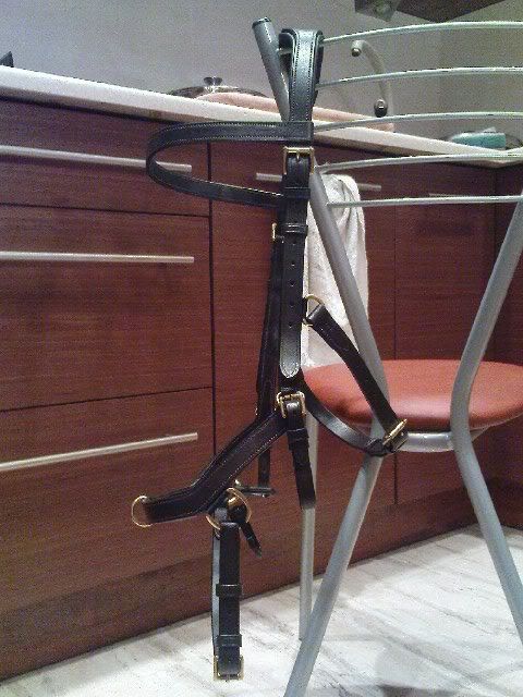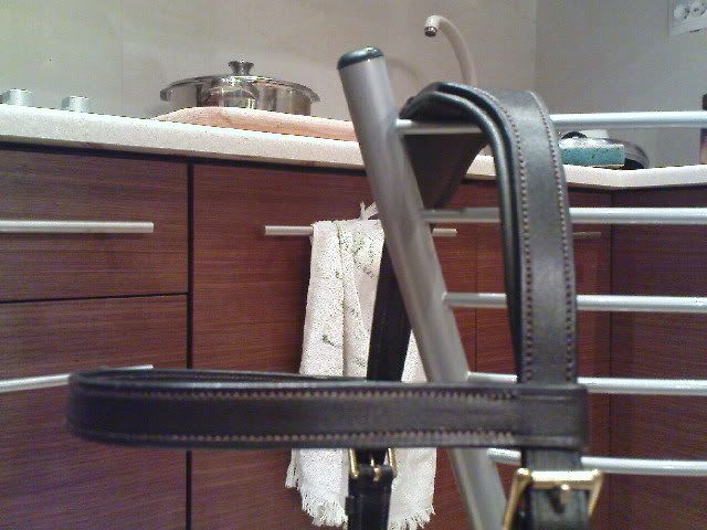 co do reszty... ostatnio zdarzało mi się eksperymentować z jazdą na takim składaku: nachrapnik hanowerski, naczółek, skórzane wodze (przypięte do metalowych kółeczek nachrapnika). nachrapnik podpinałam wyżej, jak polski. było b. fajnie, więc chcę pójść w tę stronę. tylko trochę więcej stabilizacji by się przydało (chodzi mi o odległość paski policzkowe - oczy). myślę o czymś z solidnym nachrapnikiem, miejscem do wpięcia wodzy, łączeniem paska policzkowego z nachrapnikiem stałego (bez przesuwania, jestem otwarta na różne rozwiązania). zamiast paska podgardlanego mogłoby toto mieć pasek idący pod ganaszami - jak w kawecanach (czy po prostu kantarze): od paska policzkowego, do policzkowego, mocowane "na sztywno". wolałabym ustabilizować ustrojstwo na głowie w ten sposób, bez konieczności odwoływania się do mocniejszego zapinania nachrapnika na przykład. no. coś w ten deseń.