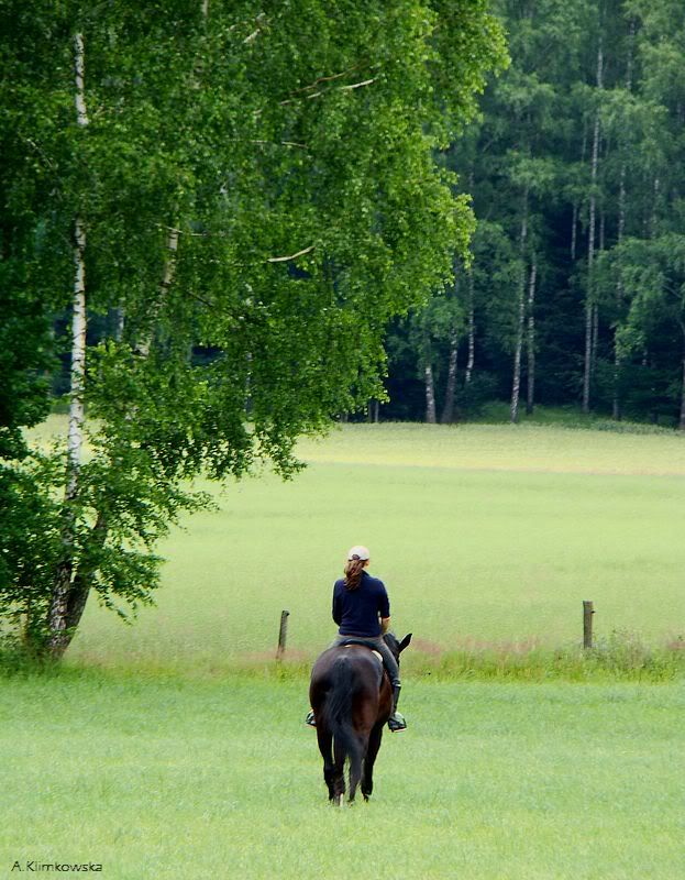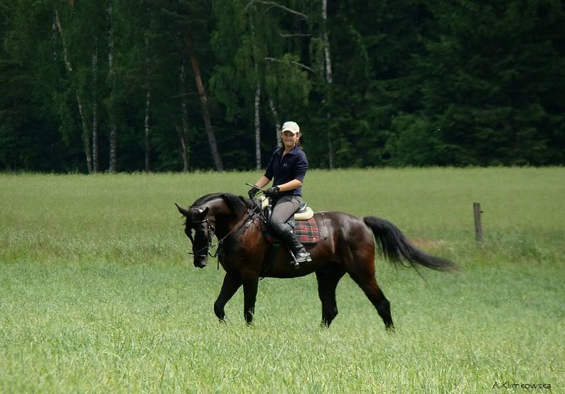 A my dzisiaj byłyśmy z Reszunią w teeerenie tak na dobry początek i rozluźnienie przed nadchodzącym zawodowym tygodniem, zdecydowanie już ma kondycję bo rwałą do przodu nieźle, momentami już mi rąk brakowało, dopiero pod koniec gdy wyszłyśmy na czoło i mogła sobie galopować bez koni z przodu zaczęła nieco się uspokajać🙂