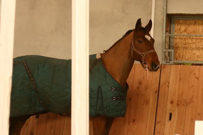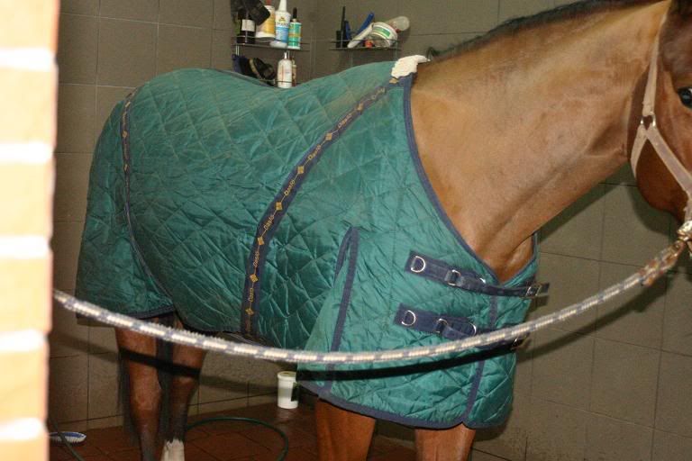 Koń nie jest golony więc 200 gram mu wystarczy w chłodnej stajni a tak naprawdę to ostatnio tej zimy było po kilka dni więc stwierdziłam że nie będę inwestowała w derkę typowo zimową. Zresztą awaryjnie mam derkę-weterankę pikowaną w romby też z Tattiniego to zrobimy "cebulkę".
