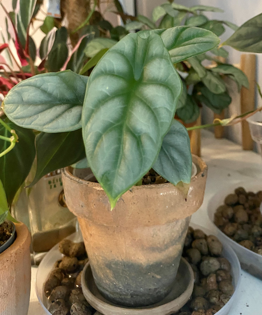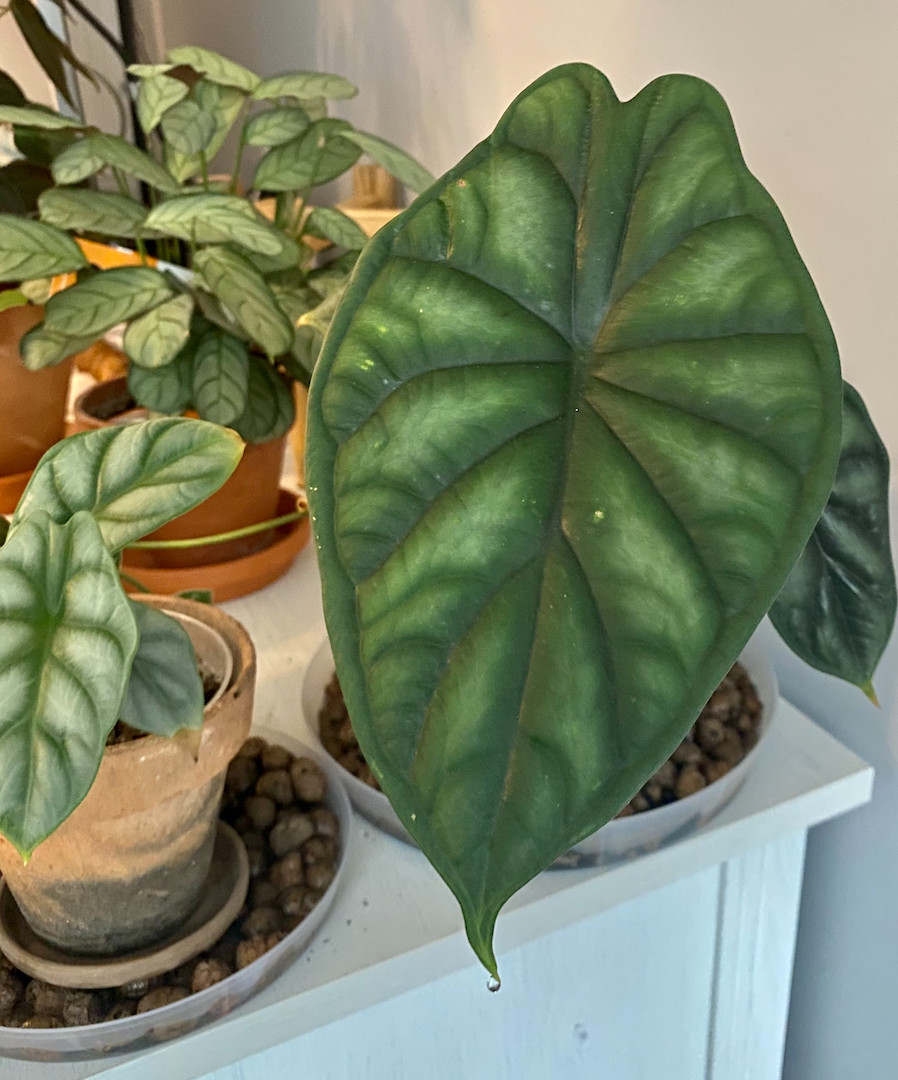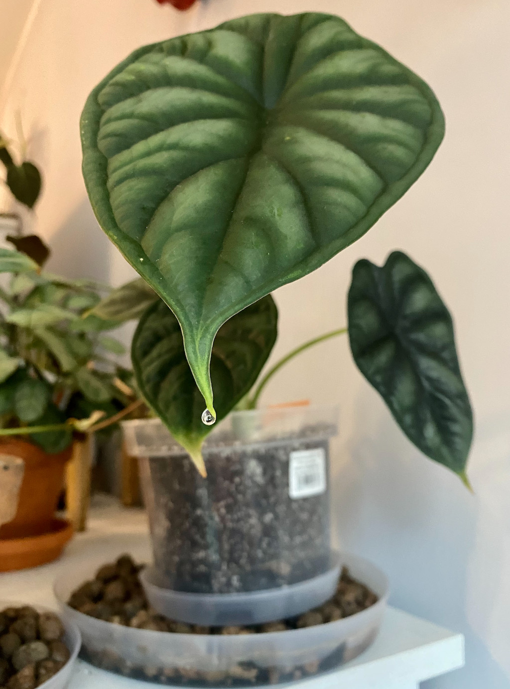Aloklazja dragon scale przeprowadza gutację (kropelka na czubku liścia) - staram się podlewać małymi ilościami, stoi na podstawce z keramzytem z wodą (nie bezpośrednio) bo bałam się, że będzie jej u mnie za sucho, a chyba jest aż za wilgotno? Zabrać jej tę podstawkę? Mimo tego ciśnie nowy liść. Bardzo nie chcę jej zabić, help 😂