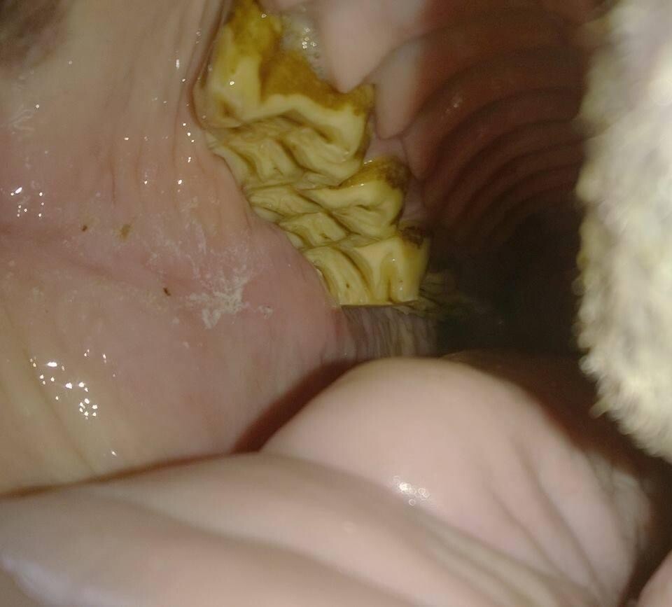 „Ostre krawędzie” powstają od strony polików na zębach szczęki i od strony języka na zębach żuchwy, na tym zdjęciu widać. Zobacz jaka nierówna jest powierzchnia trąca na „normalnych” zębach. Ten z poprzedniego zdjęcia ma powierzchnie równą jak tarcza tarnika, pomimo tego że od tarnikowanie minęło sporo czasu.