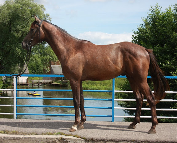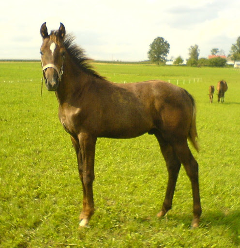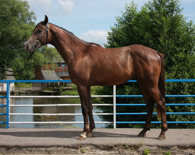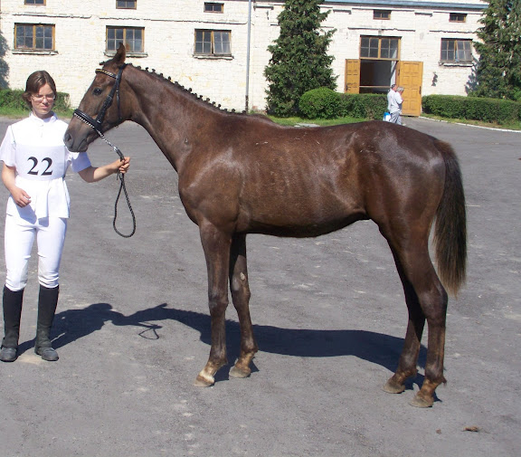 Po pierwsze - szyja. Ja bym się tak bardzo nie czepiała długości, a raczej tego, że jest bardzo prosta i raczej o poziomym ułożeniu. Dobra ujeżdżeniowa szyja powinna wychodzić z kłody w górę - łagodnie, ale wyraźnie powinien być kierunek "wyżej". Warto jedna zwrócić uwagę, że im późniejsze zdjęcia, tym bardziej ta szyja ładnie wyrabia się mięśniowo - nawet pojawia się delikatny łuczek górnej linii.