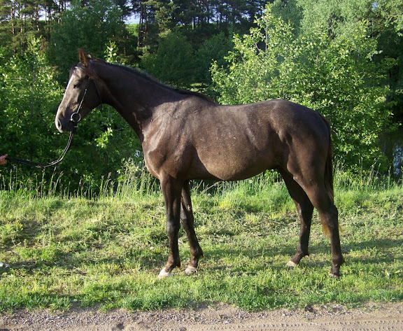 To, co chyba najbardziej mi daje do myślenia, to zad. Górna linia - jest prawie prosta (odcinek od górnej części kości biodrowej do ogona - bardzo wyraźnie to widać na pierwszych fotkach. Guz kulszowy też jest dość wysoko. Takim koniom jest trudno opuścić i podstawić zad, bo musiałyby się łamać w miednicy (często zresztą mają tendencję do pedałowania nogami w tył, zamiast podkładania ich pod kłodę - ale tego u Groma akurat nie widziałam). I znowu wyraźnie widać, jak koń mieśniowo sobie pomaga dążyć do lepszej dla pracy budowy - zad się zaokrąglił, na jego górnej linii wyraźnie wybudowała się bardzo dobra muskulatura. Stąd też pewnie to wrażenie lekkiego przebudowania - na wcześniejszych fotkach absolutnie nie widać, żeby zad był wysoko.
