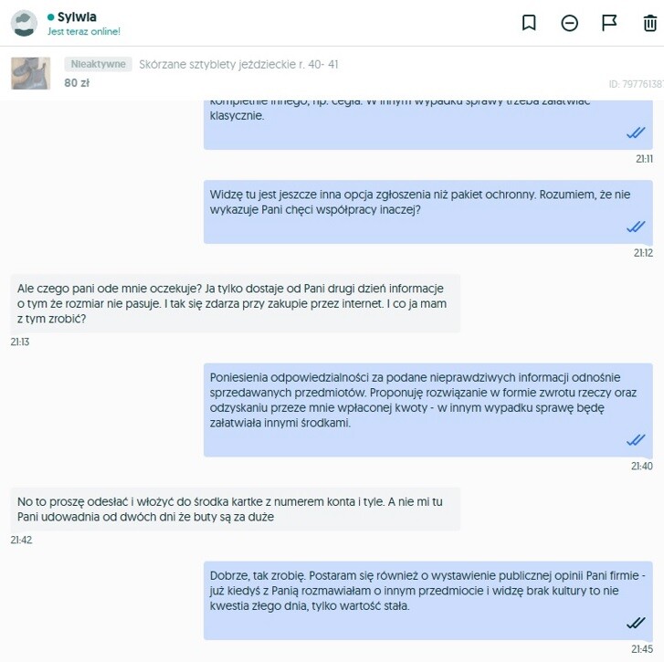 Po informacji że siodło do mnie dotarło, lecz nie jest zgodne z opisem kontakt się urwał i zostałam prawdopodobnie zablokowana. Nie mam jak odesłać siodła bo było nadawane przez punkt nadań a poza tym paczka i tak na pewno nie zostałaby odebrana.