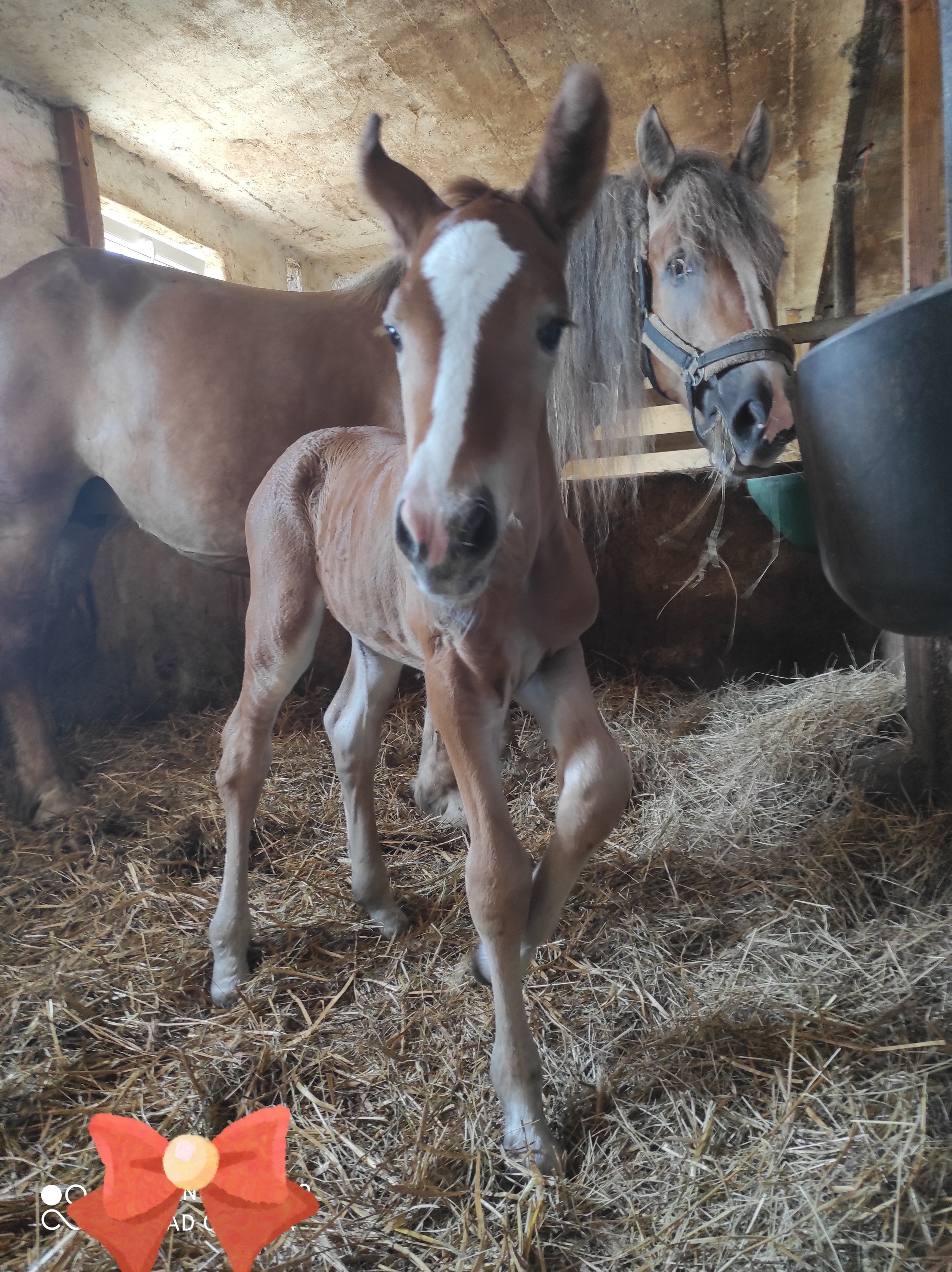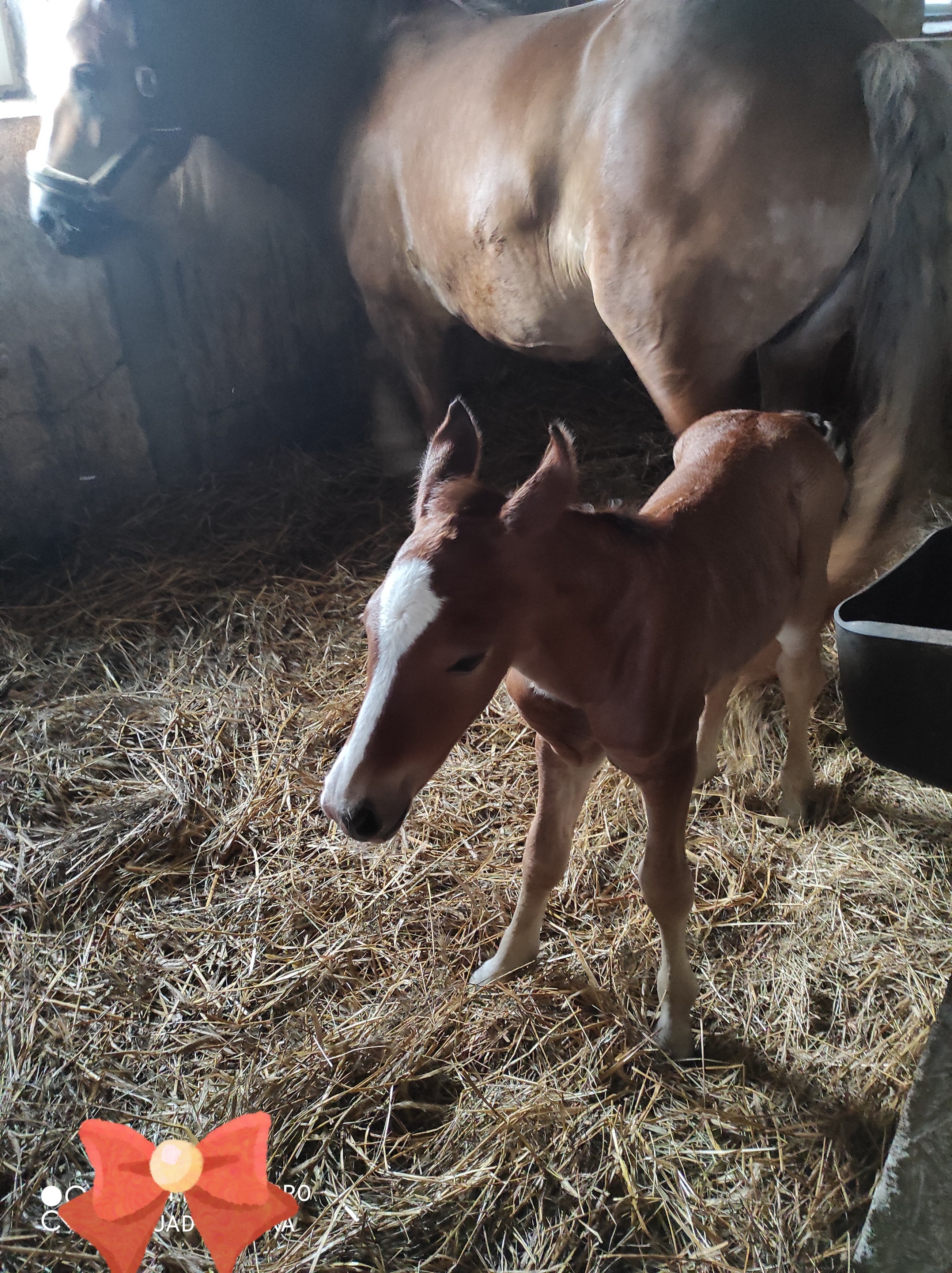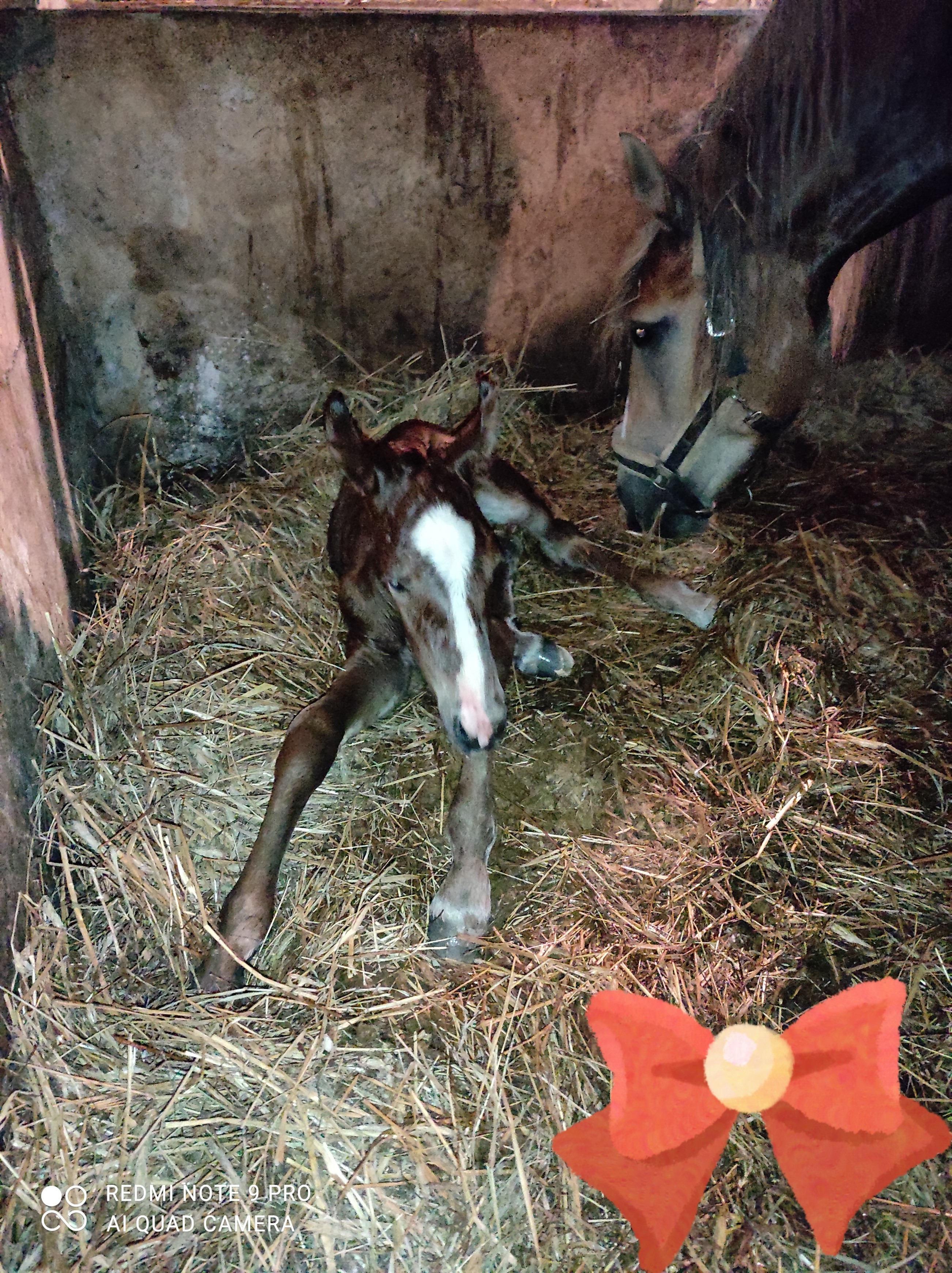 Miałam tylko trochę obaw co do łożyska ,bo klacz dopiero po dwuch godzinach od porodu w ogóle je pokazała i oddała . Po wyźrebieniu wisiała tylko pępowina i pierwszy raz się z tym spotkałam dlatego trochę stracha miałam ,zawsze jak klacz wstała to wszytko wisiało i tylko podwiązywałam żeby nie przydepnęła a tutaj nic nie było .
